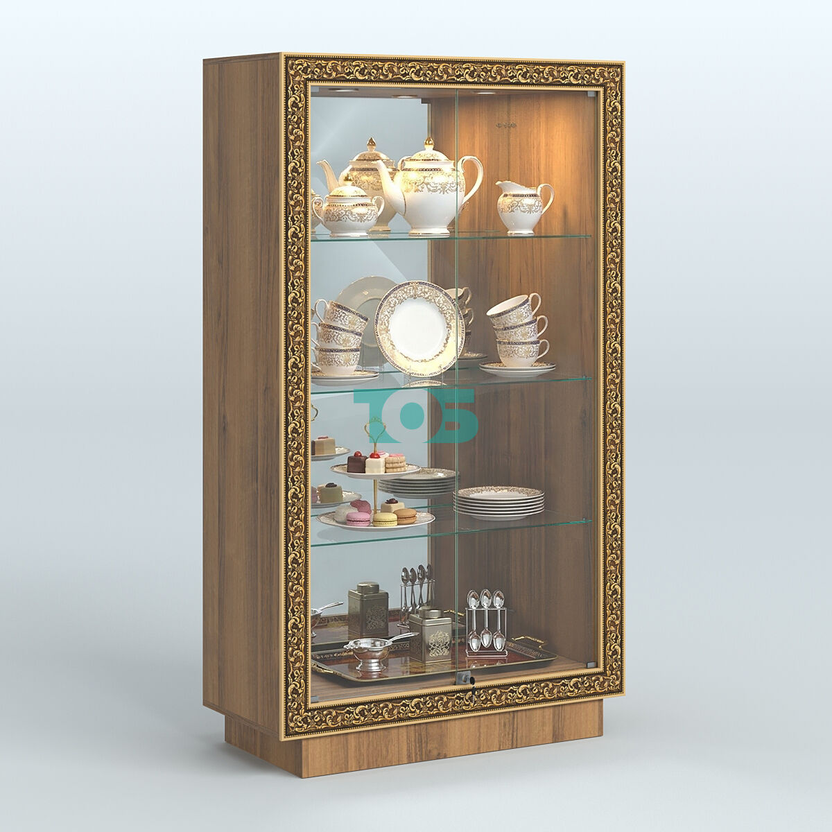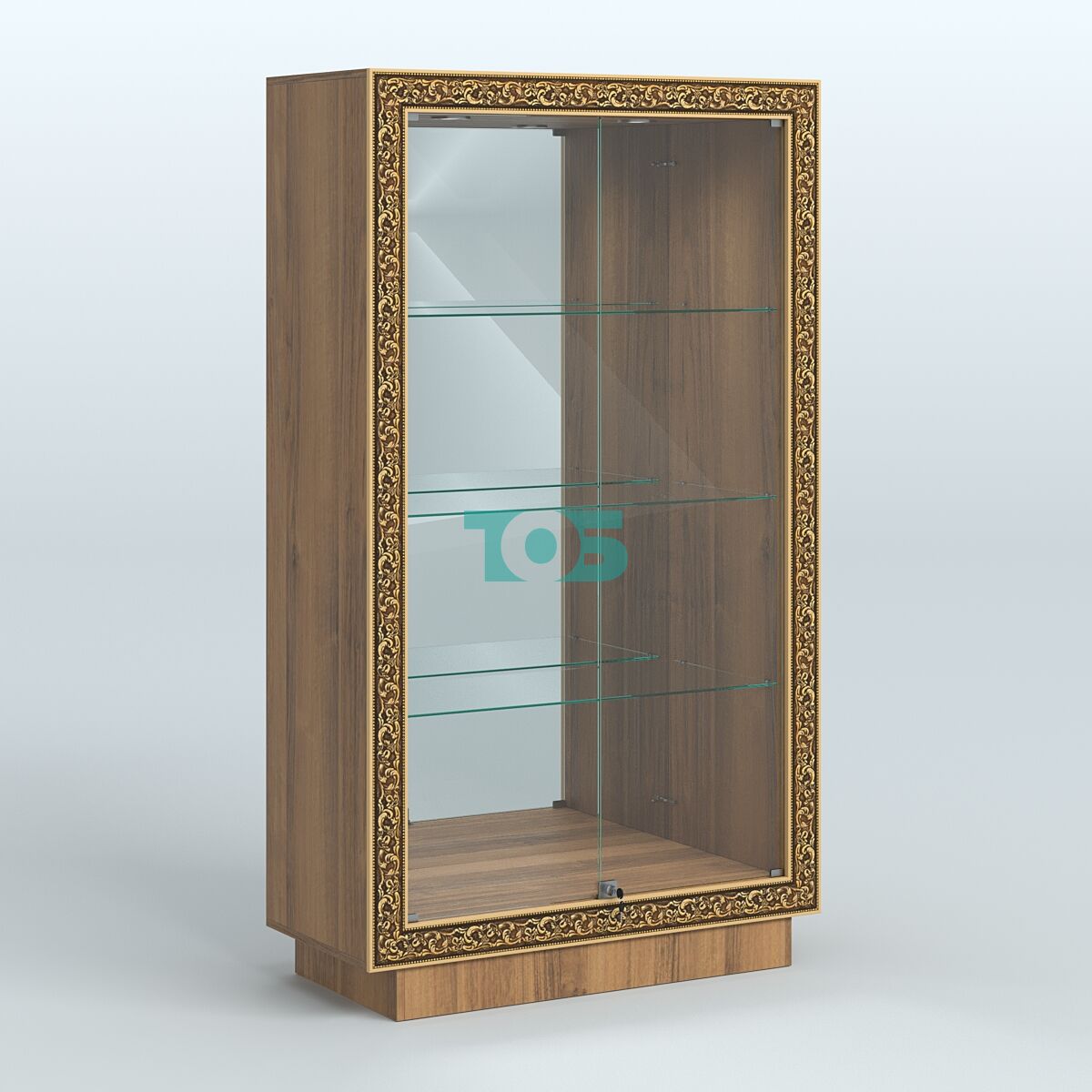 Фасадная часть: декорирована цветными молдингами под золото, которые подчёркивают чёткость линий и помогают вписать витрину в интерьер любого стиля.