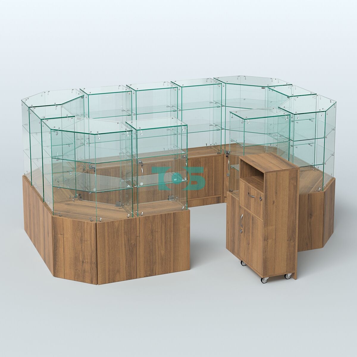 - со стороны продавца в верхней части - стеклянные дверки с замком, в накопителе - двери ДСП с замком;
