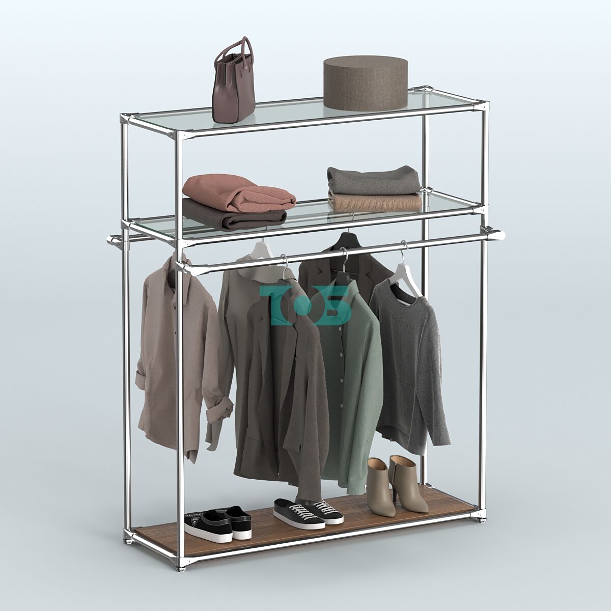 Задняя стенка: отсутствует, что способствует визуальному расширению пространства и облегчает доступ к товарам с разных сторон.