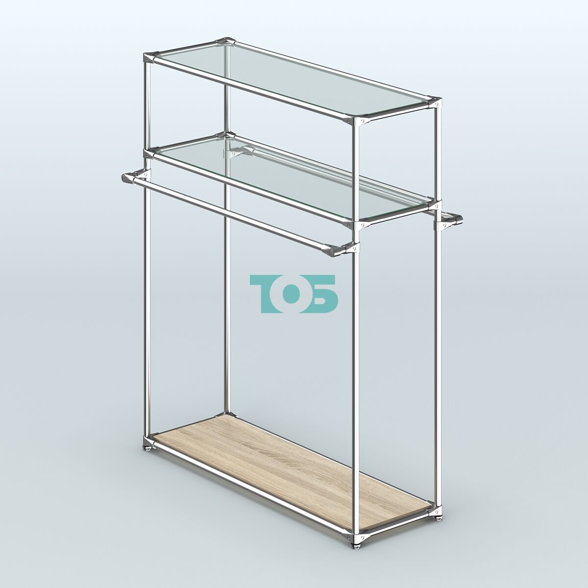 Одна стеклянная полка с возможностью регулирования по высоте: предоставляет дополнительные возможности для гибкой организации пространства и выкладки товаров на разных уровнях.
