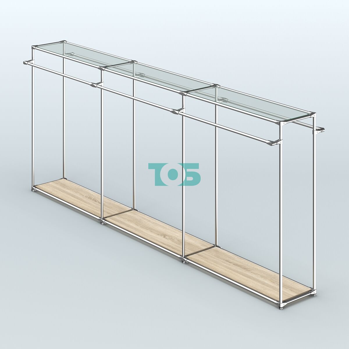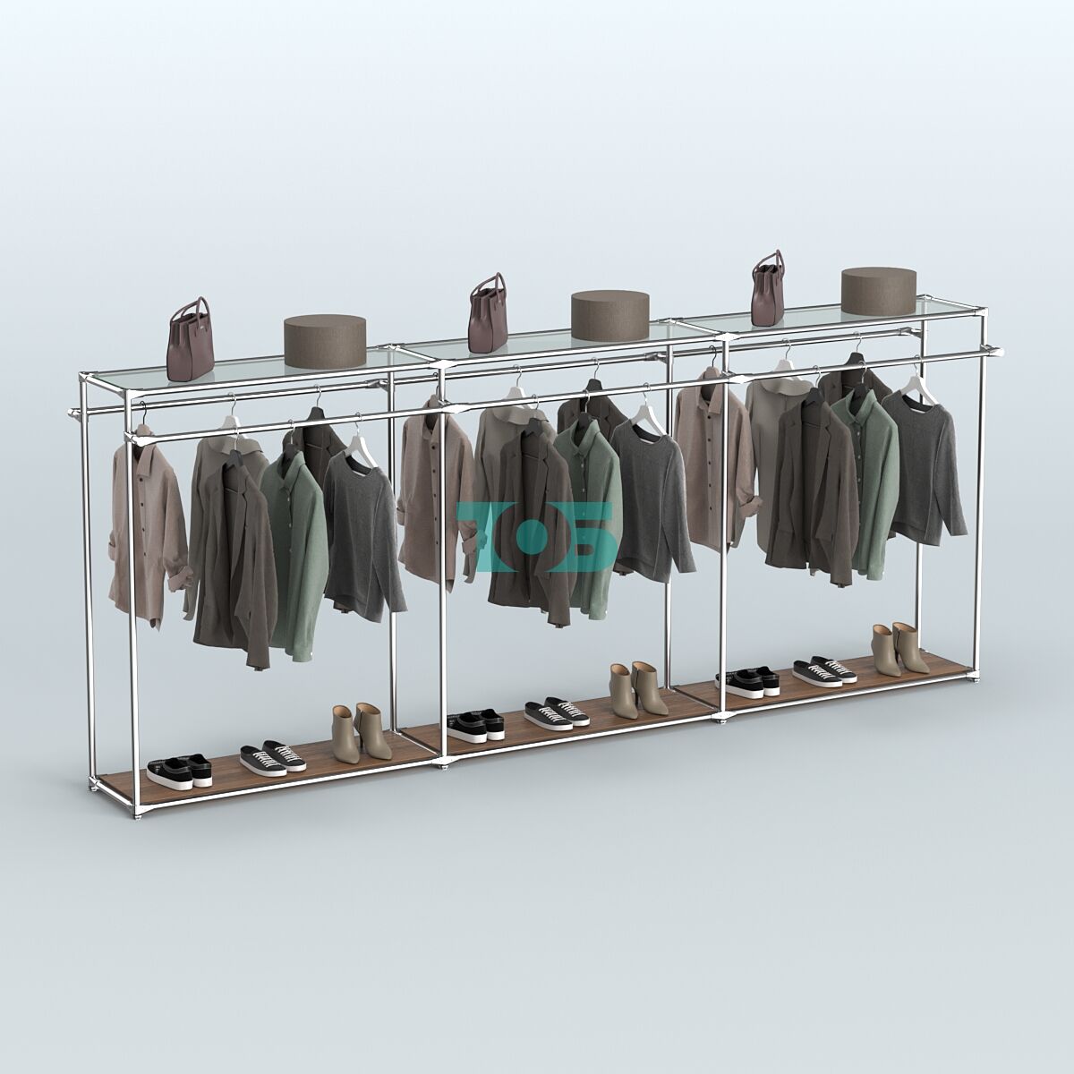 Поручни: система оснащена шестью продольными поручнями для одежды, что обеспечивает удобство размещения товаров и доступ к ним покупателей.