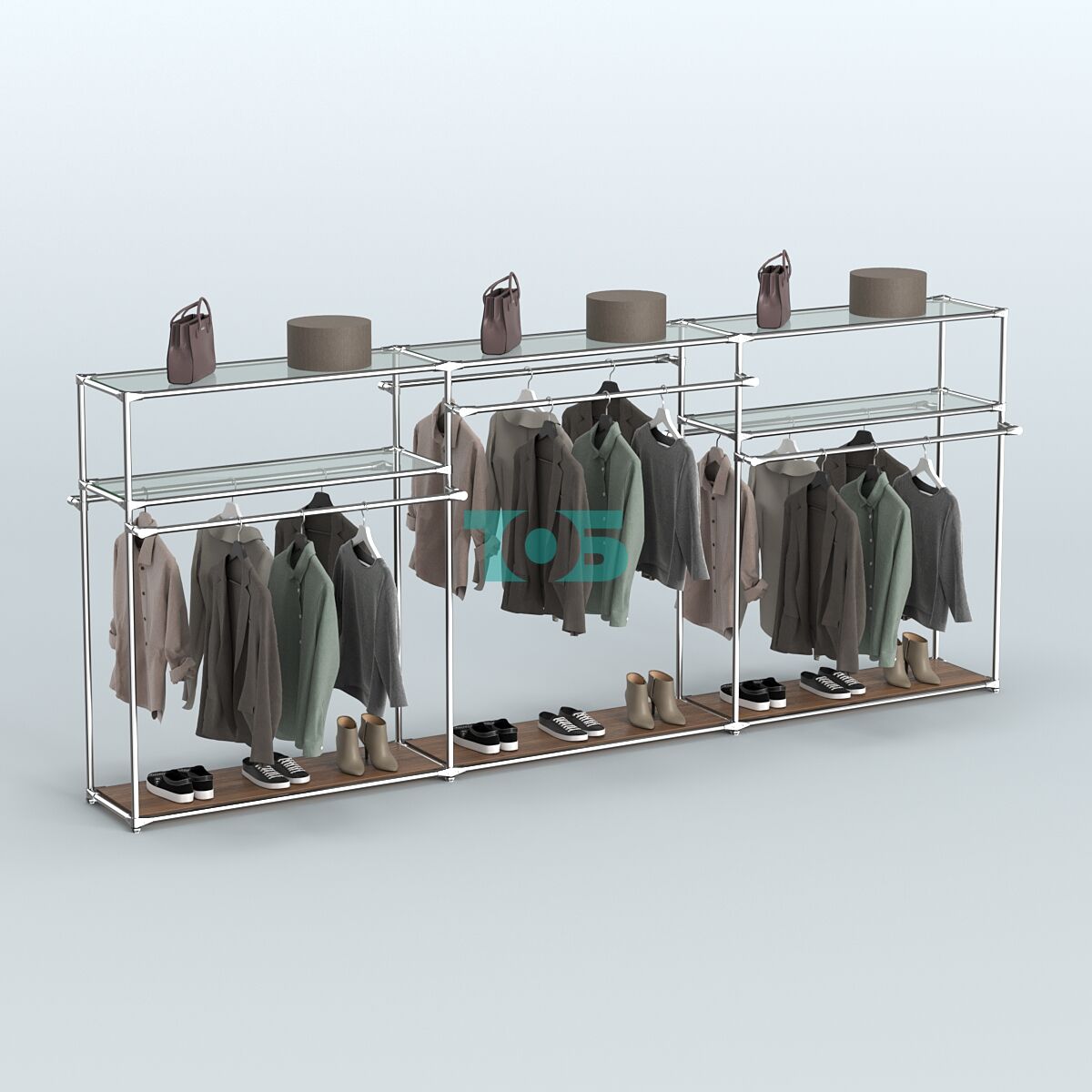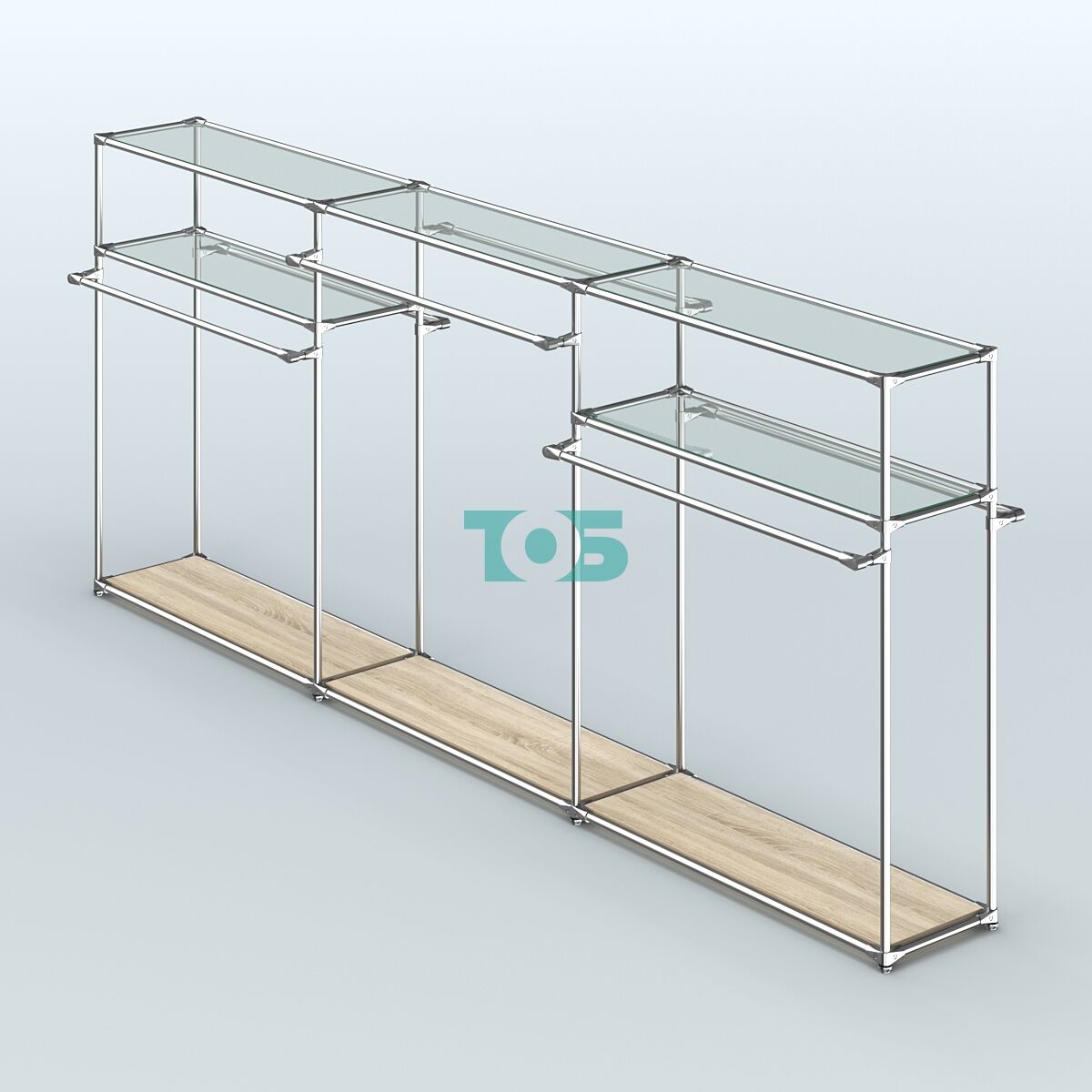 Поручни: система оснащена шестью выносными поручнями для одежды, что обеспечивает удобство размещения товаров и доступ к ним покупателей.
