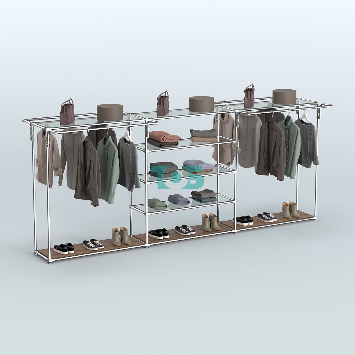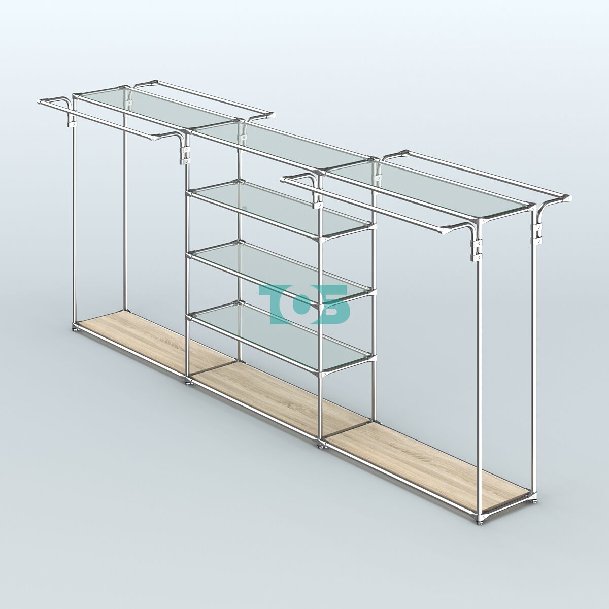 Поручни: система оснащена четырьмя выносными усиленными поручнями для одежды, что обеспечивает удобство размещения товаров и доступ к ним покупателей.
