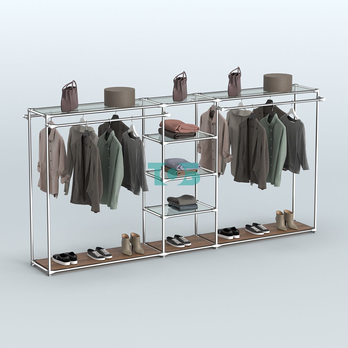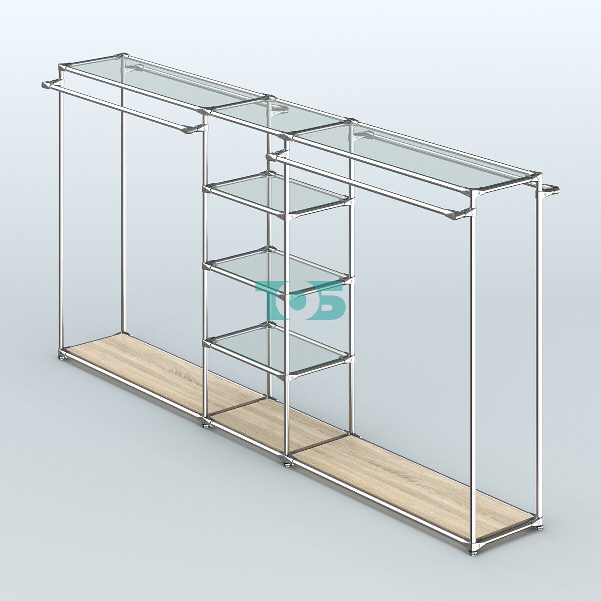 Поручни: система оснащена четырьмя выносными поручнями для одежды, что обеспечивает удобство размещения товаров и доступ к ним покупателей.