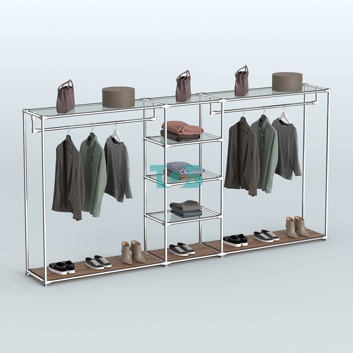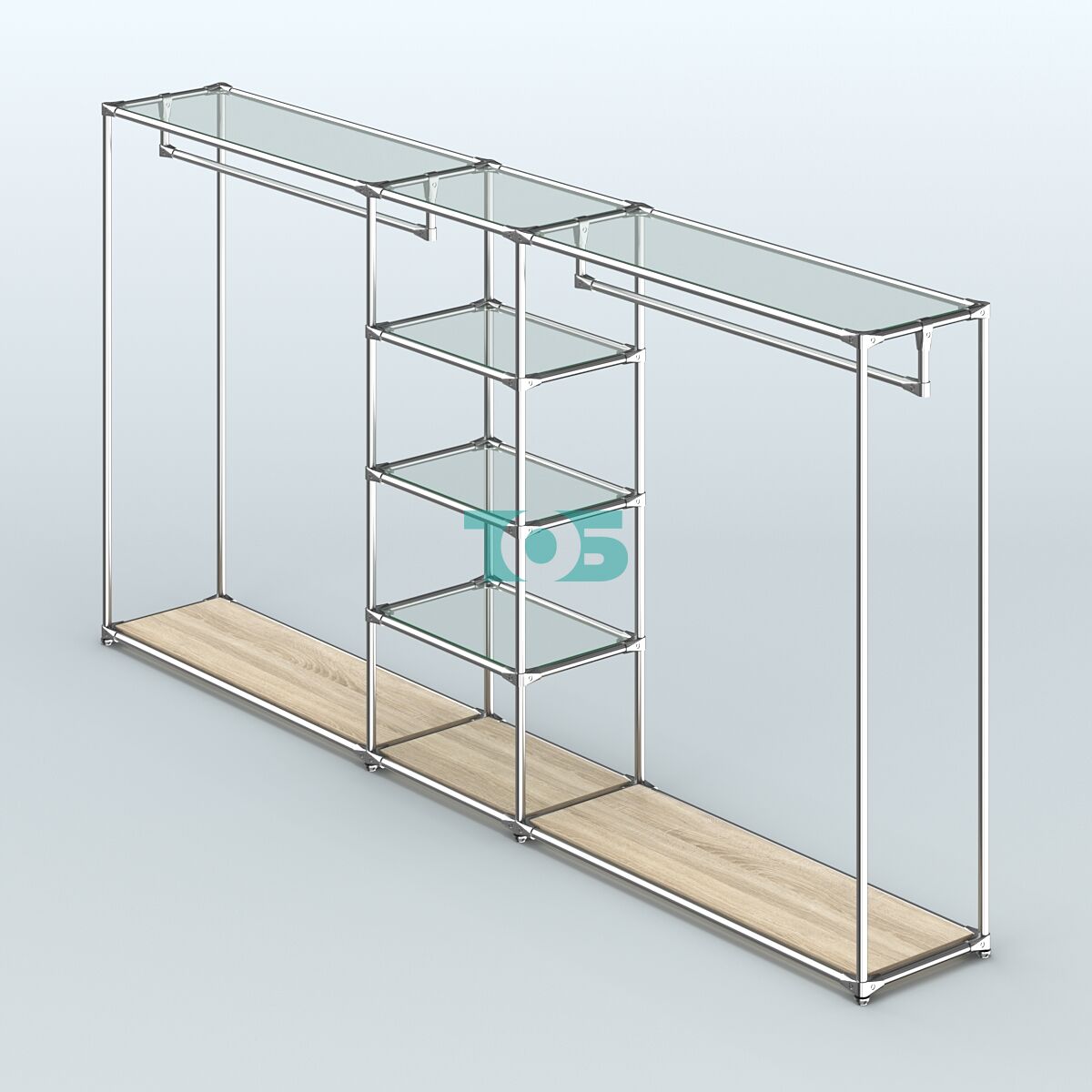 Поручни: система оснащена двумя внутренними поручнями для одежды, что обеспечивает удобство размещения товаров и доступ к ним покупателей.