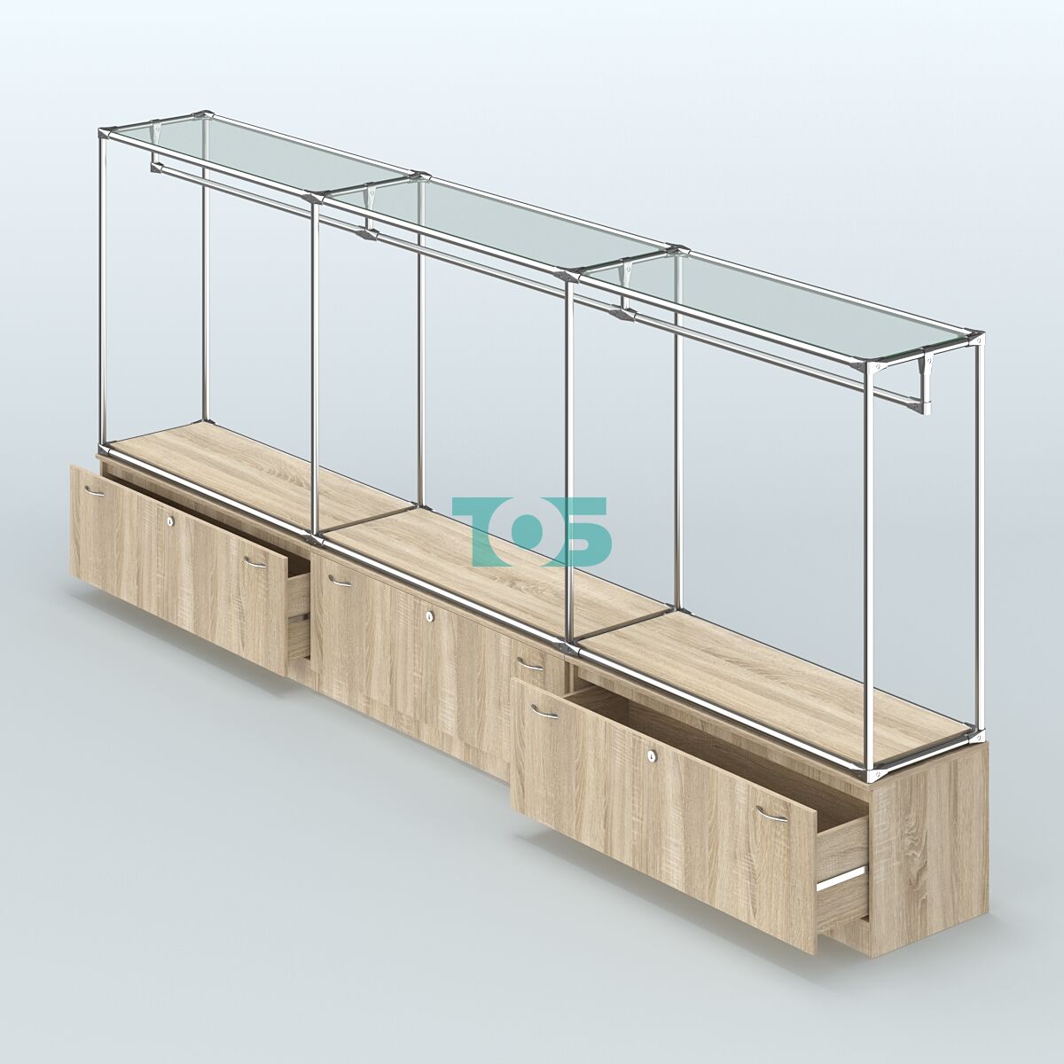 Накопитель: включает три тумбы с выдвижными ящиками, оснащёнными врезными замками. Это обеспечивает безопасное хранение товаров и документов.