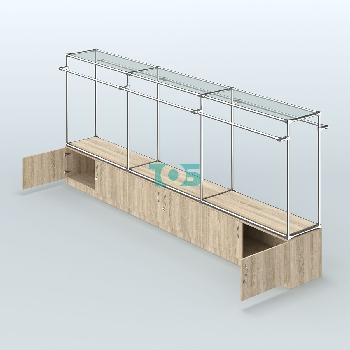 Накопитель: включает три тумбы с распашными дверьми, оснащёнными врезными замками. Это обеспечивает безопасное хранение товаров и документов.