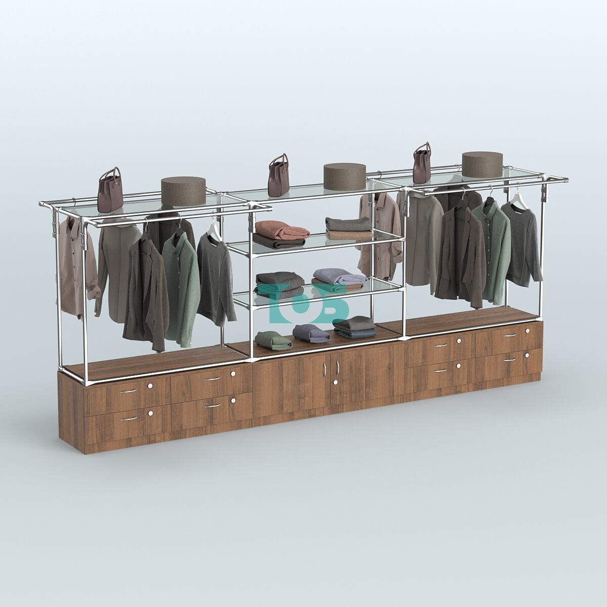 Стеклянные полки: в центральной части системы расположены две стеклянные полки, которые позволяют дополнительно организовать пространство для размещения товаров или декоративных элементов.