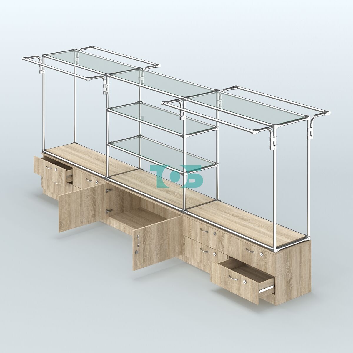 Накопитель: включает три тумбы, каждая из которых оснащена четырьмя выдвижными ящиками с врезными замками. Это обеспечивает безопасное и удобное хранение товаров и документов.