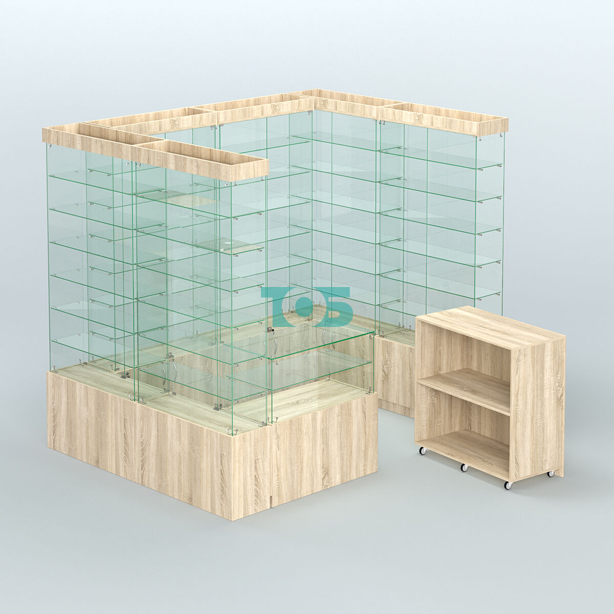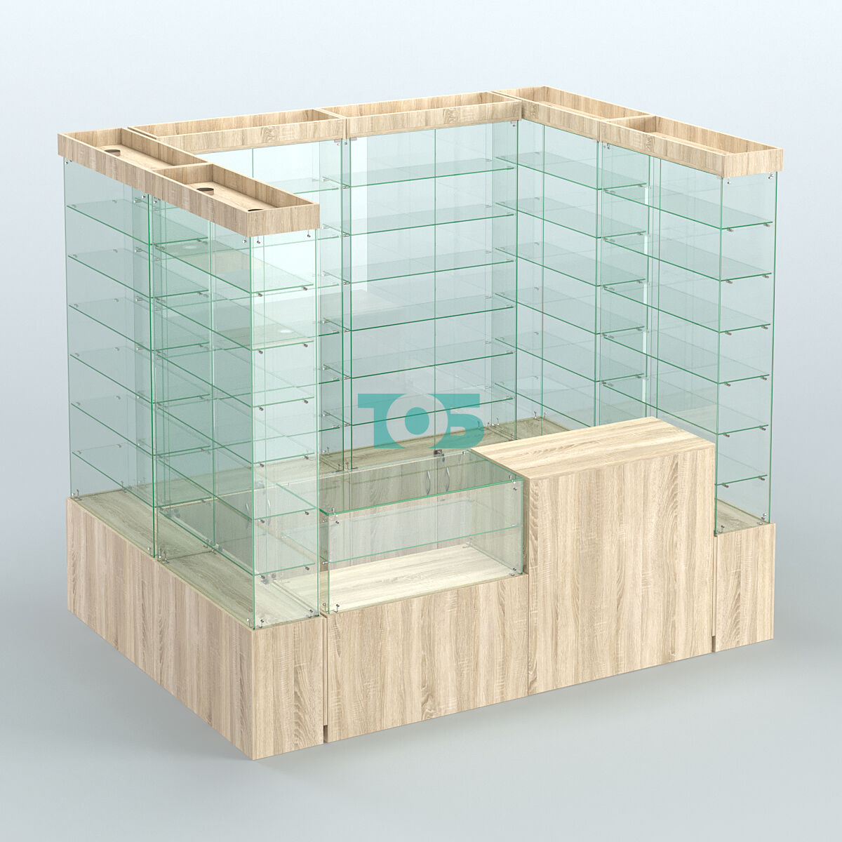 один прилавок с открытым накопителем и стеклянным верхом, в котором размещается одна стеклянная полка.