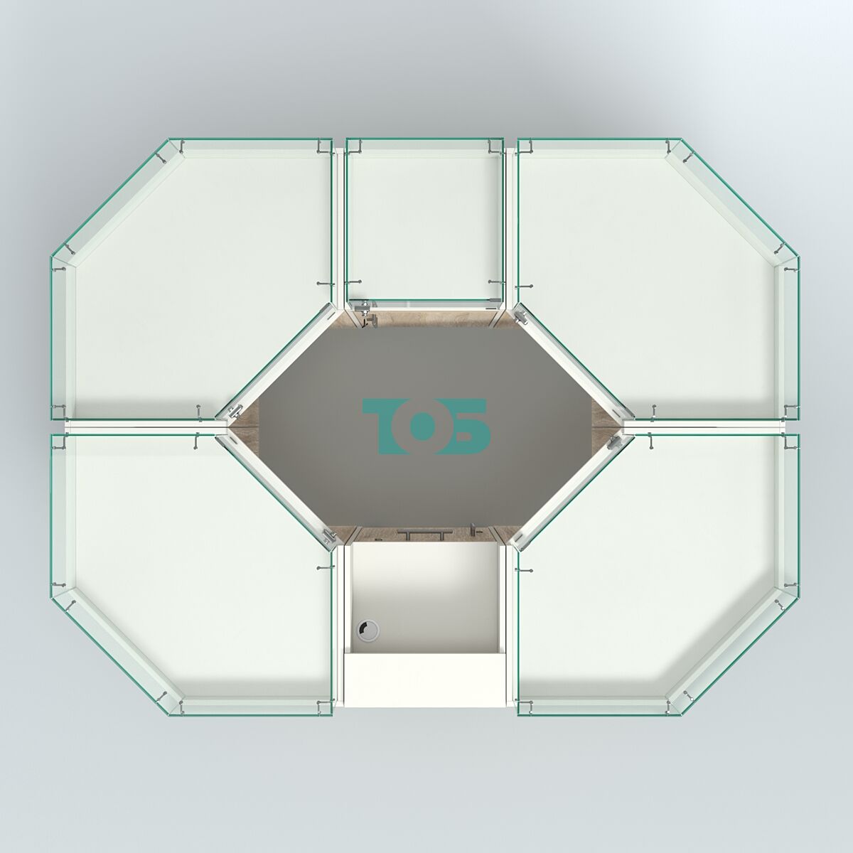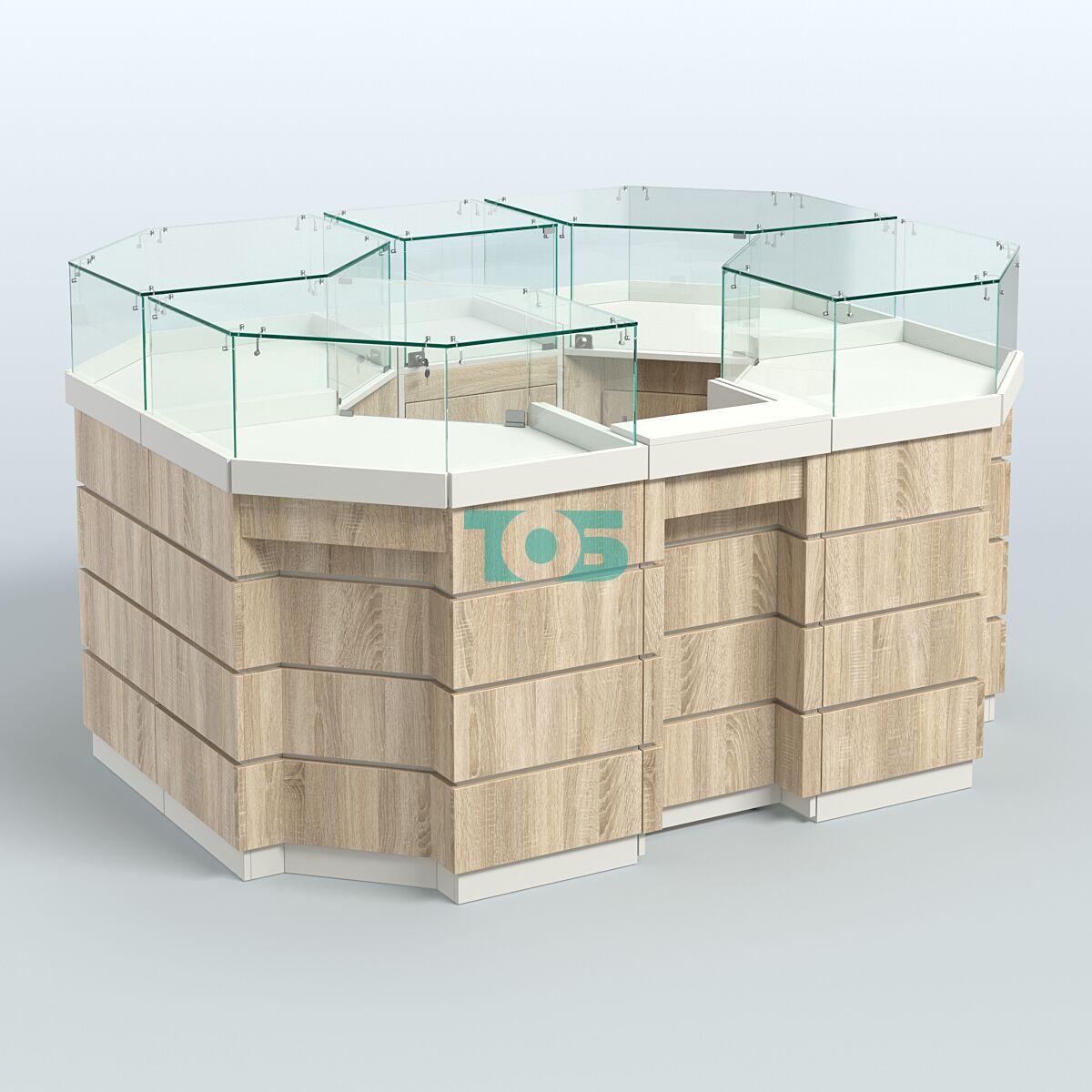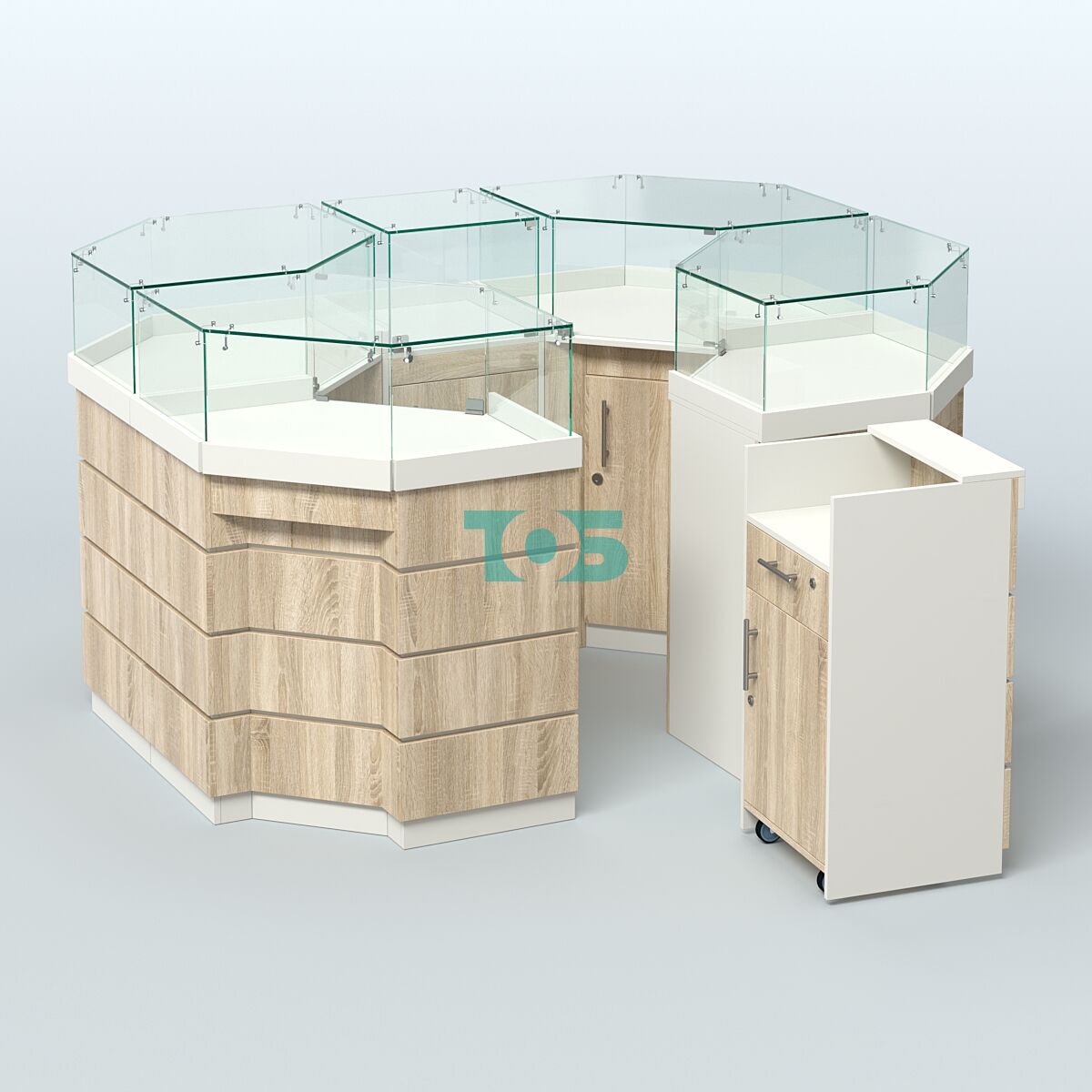 - островок включает четыре угловых модуля, один узкий модуль шириной 450 мм и один прилавок под кассу на металлических колесах, выполняющий функцию входной зоны;