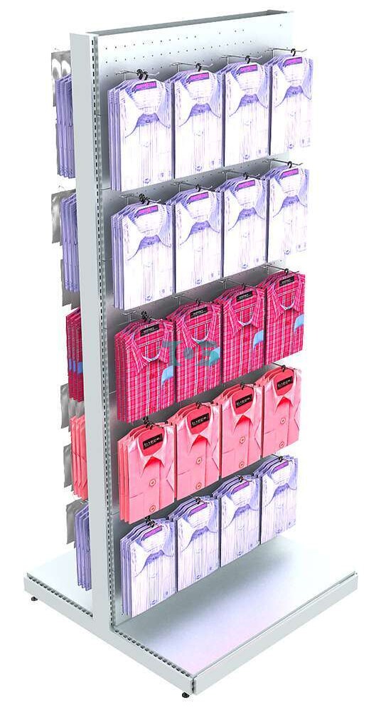 Отличия модели высокого островного металлического стеллажа с перфорацией для демонстрации рубашек: