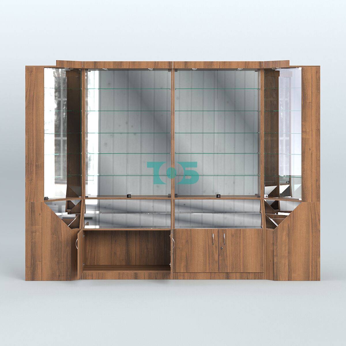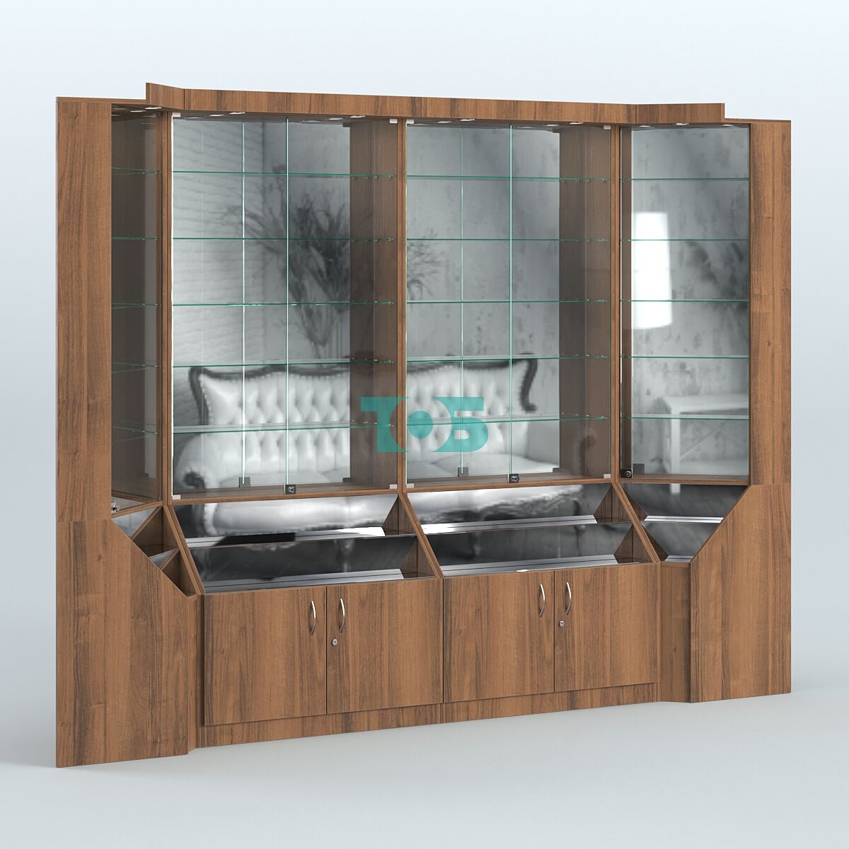 - Витрины оборудованы верхним фризом с подсветкой, зеркальной задней стенкой, запирающимися на ключ дверцами.