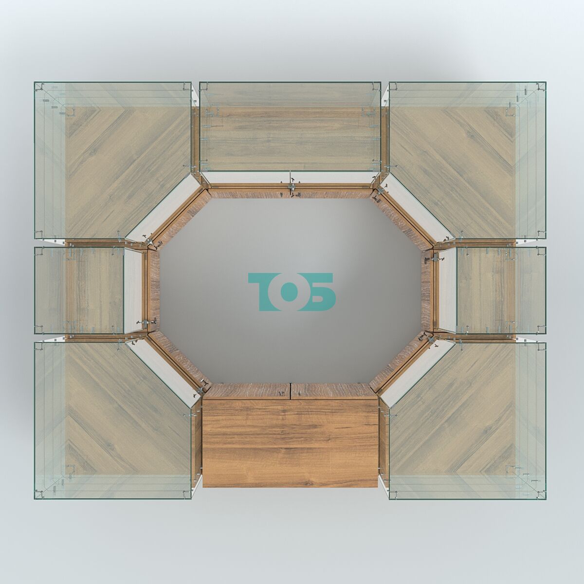 Габаритные размеры: могут быть изменены в зависимости от стандартных блоков витрин, что даёт возможность адаптировать павильон под конкретные условия и требования.