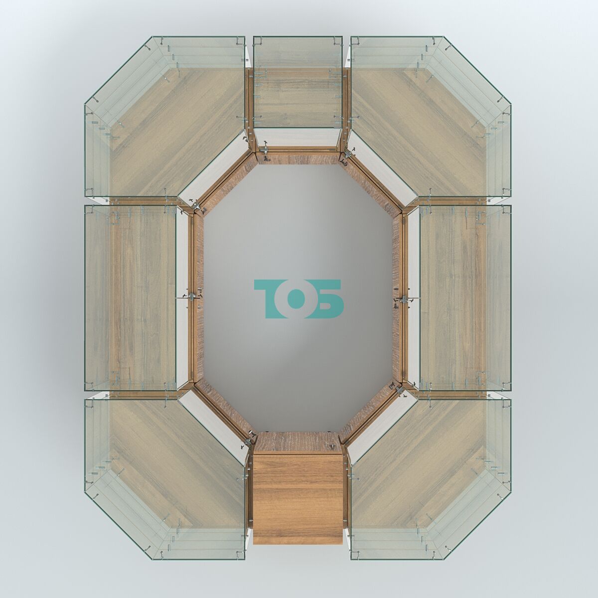 Габаритные размеры: могут быть изменены в зависимости от стандартных блоков витрин, что даёт возможность адаптировать павильон под конкретные условия и требования.