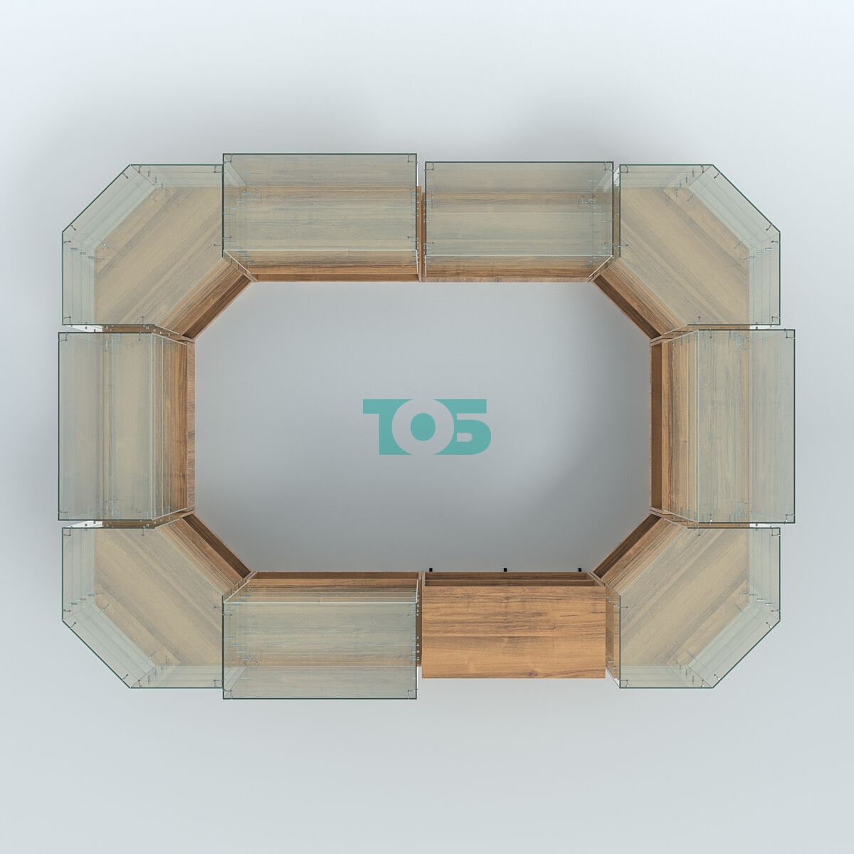 Габаритные размеры: могут быть изменены в зависимости от стандартных блоков витрин, что даёт возможность адаптировать павильон под конкретные условия и требования.