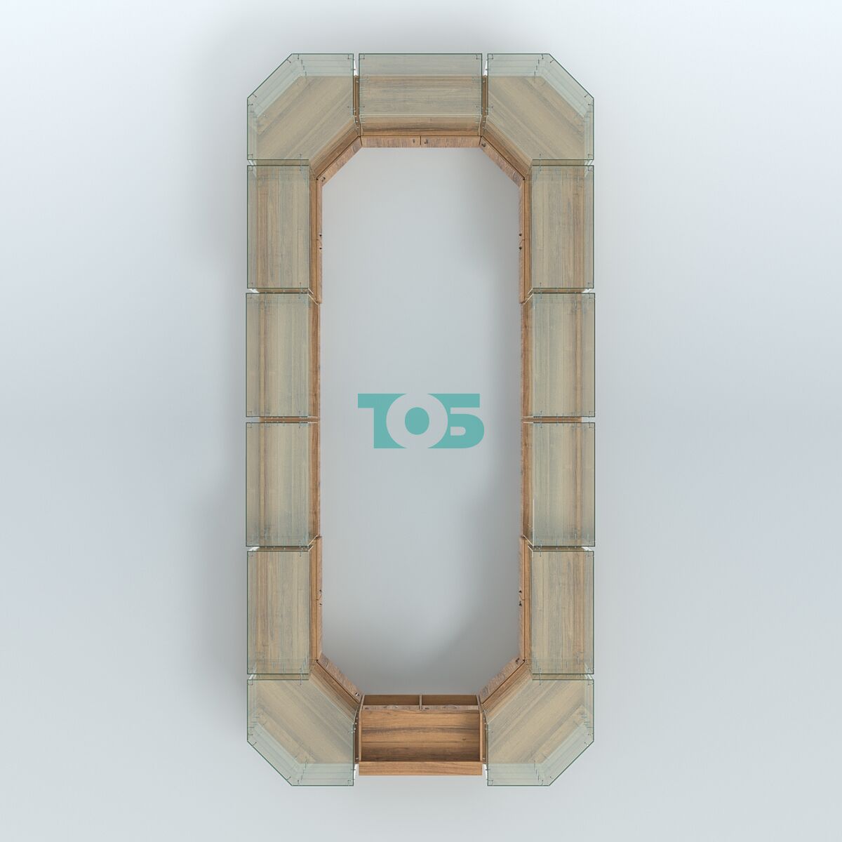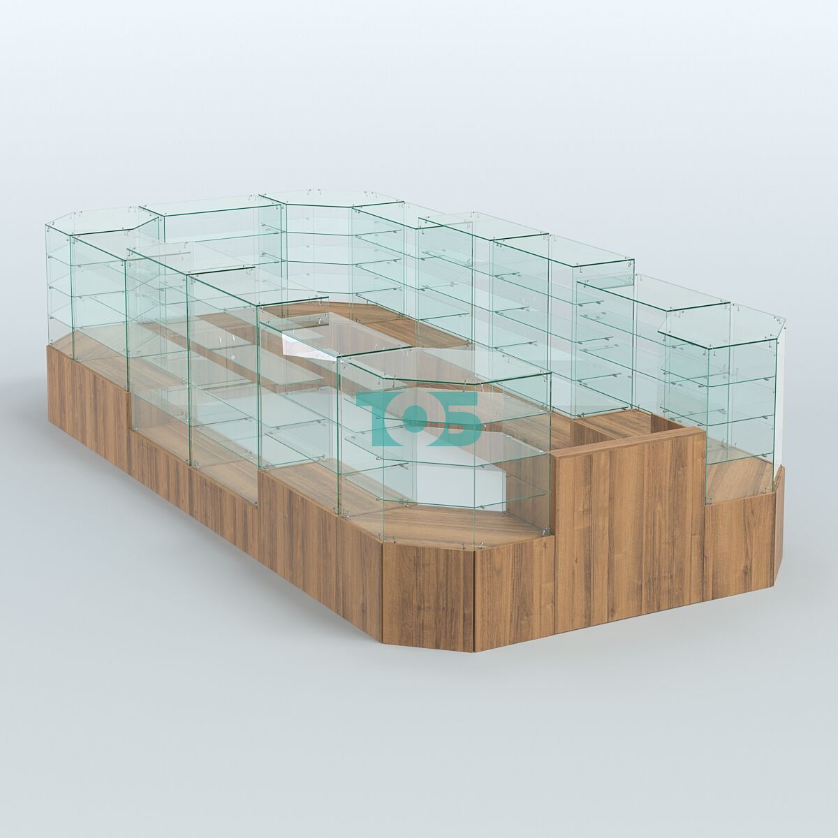 Габаритные размеры: могут быть изменены в зависимости от стандартных блоков витрин, что даёт возможность адаптировать павильон под конкретные условия и требования.