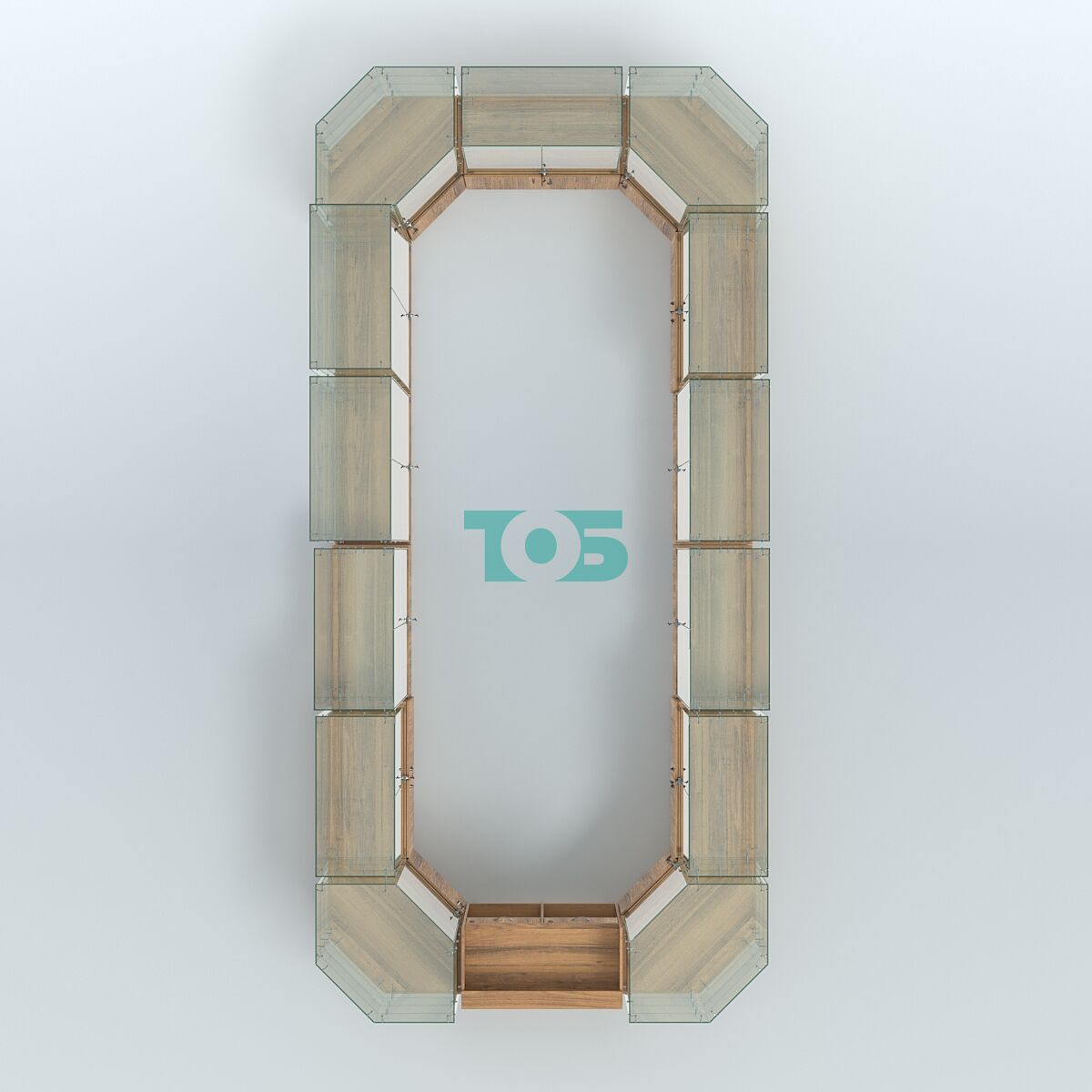 Габаритные размеры: могут быть изменены в зависимости от стандартных блоков витрин, что даёт возможность адаптировать павильон под конкретные условия и требования.