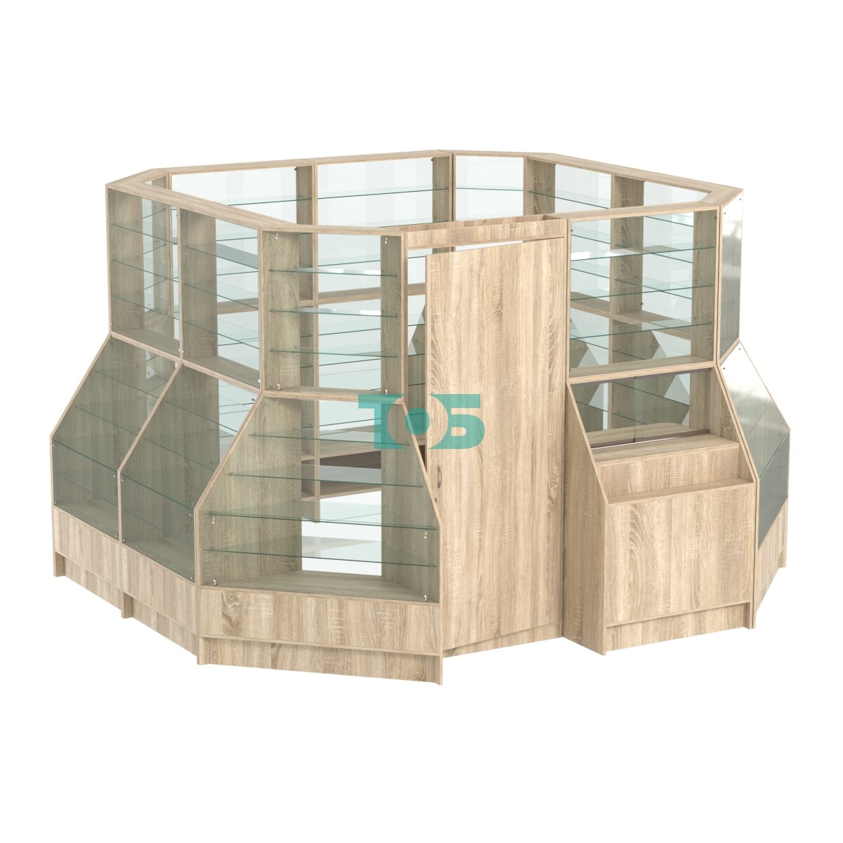 Полки: в каждой секции, кроме центральной, расположено по 7 стеклянных полок. В центральной секции находится окно выдачи и 4 стеклянные полки. Это обеспечивает достаточное пространство для размещения товаров.