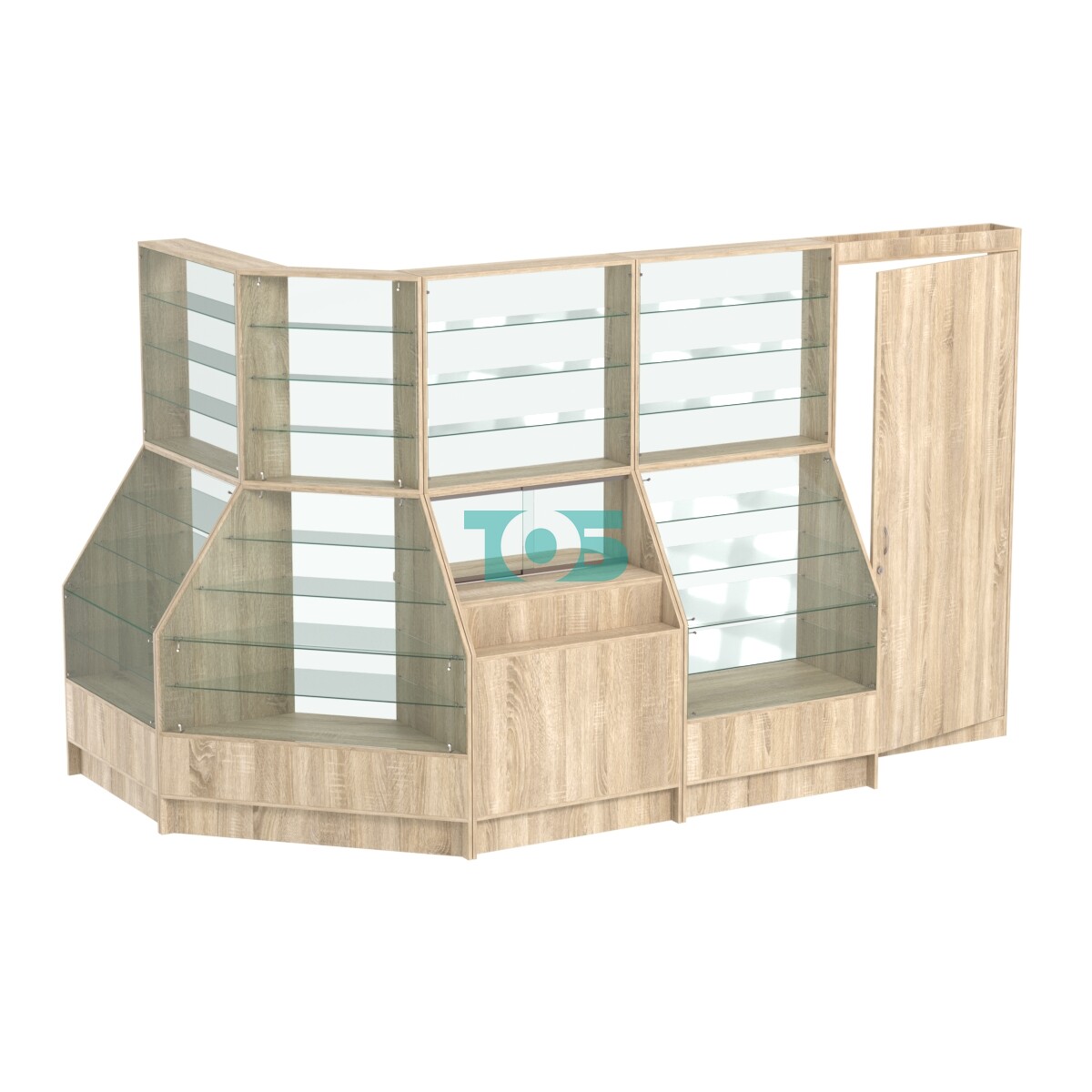 Полки: в каждой секции павильона, кроме центральной, расположено по 7 стеклянных полок. В центральной секции находится окно выдачи и 4 стеклянные полки, что обеспечивает достаточно места для размещения товаров.