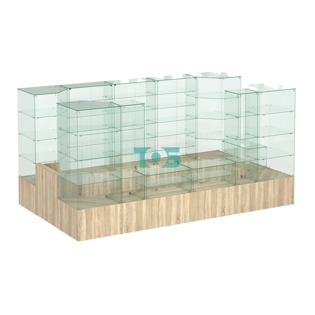 Верх витрины и задняя стенка: выполнены из стекла, что создаёт ощущение лёгкости и прозрачности, а также позволяет максимально использовать естественное освещение.