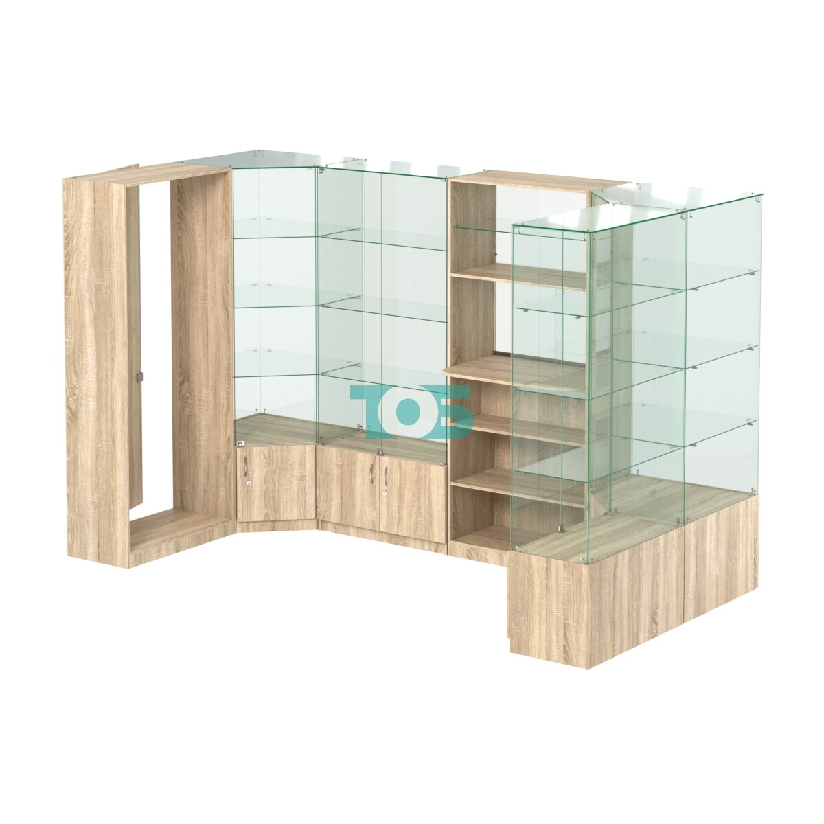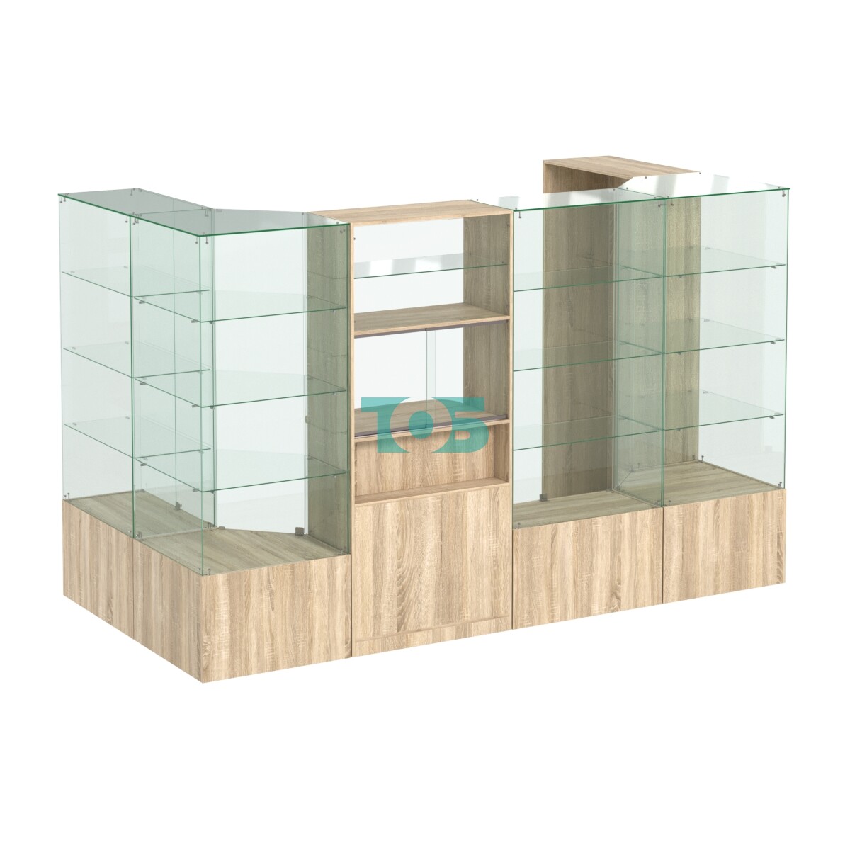 Высота стеклянных витрин: высота стеклянных витрин составляет 2020 мм, а дверной блок с витриной-прилавком — 2100 мм, что создаёт ощущение простора и позволяет эффективно использовать вертикальное пространство.