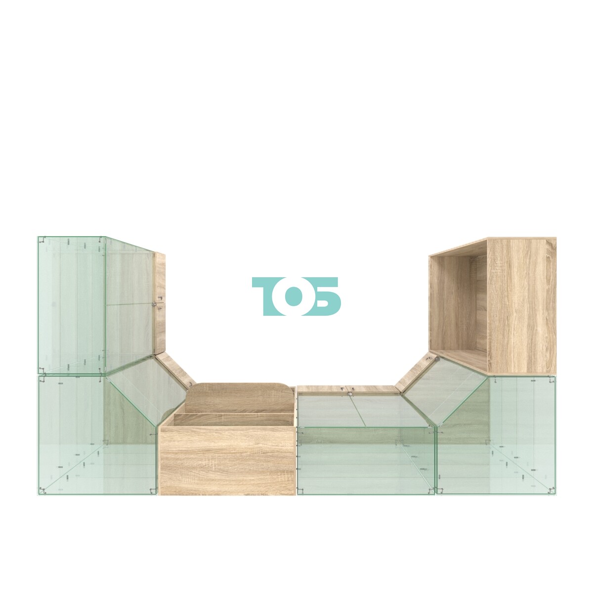 Габаритные размеры: размеры павильона могут быть изменены в зависимости от стандартных блоков витрин, что позволяет адаптировать его под конкретные условия и требования.