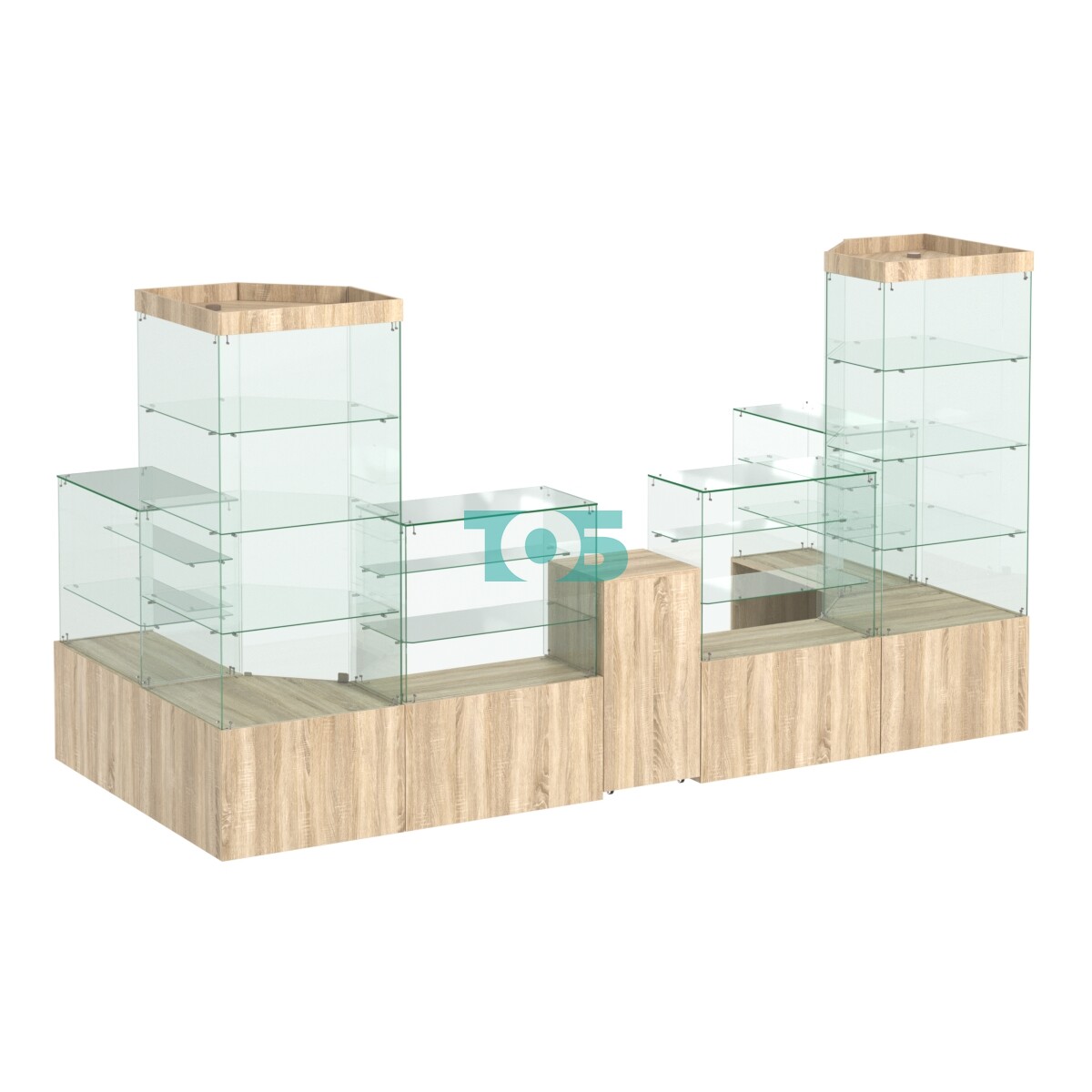 Габаритные размеры: могут быть изменены в соответствии со стандартными блоками витрин, что позволяет адаптировать павильон под конкретные потребности.