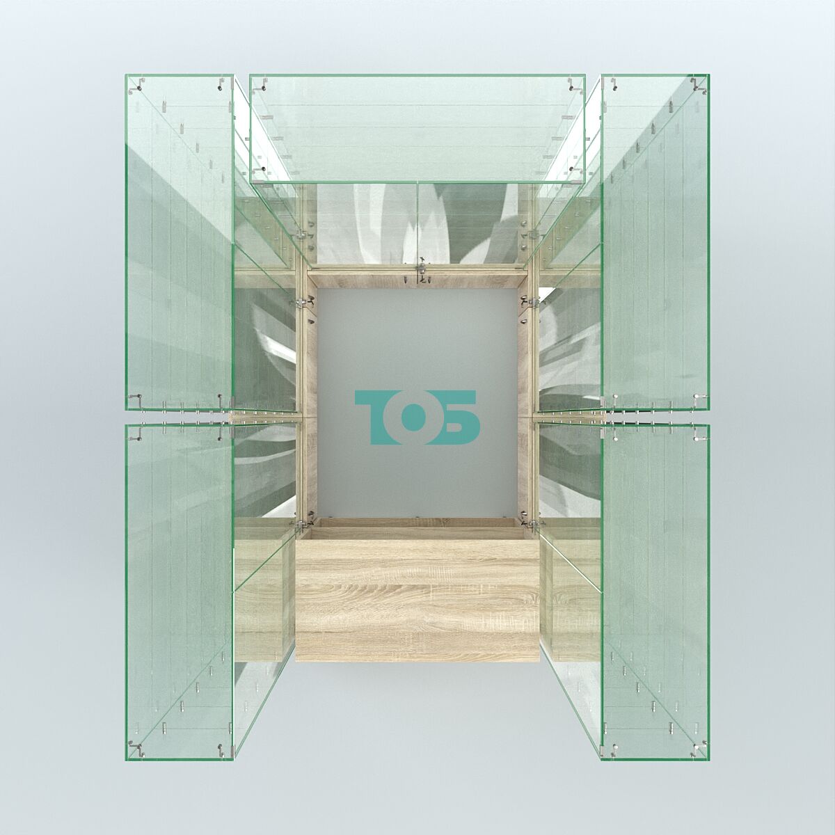 • полки — по 6 стеклянных полок в каждой витрине.