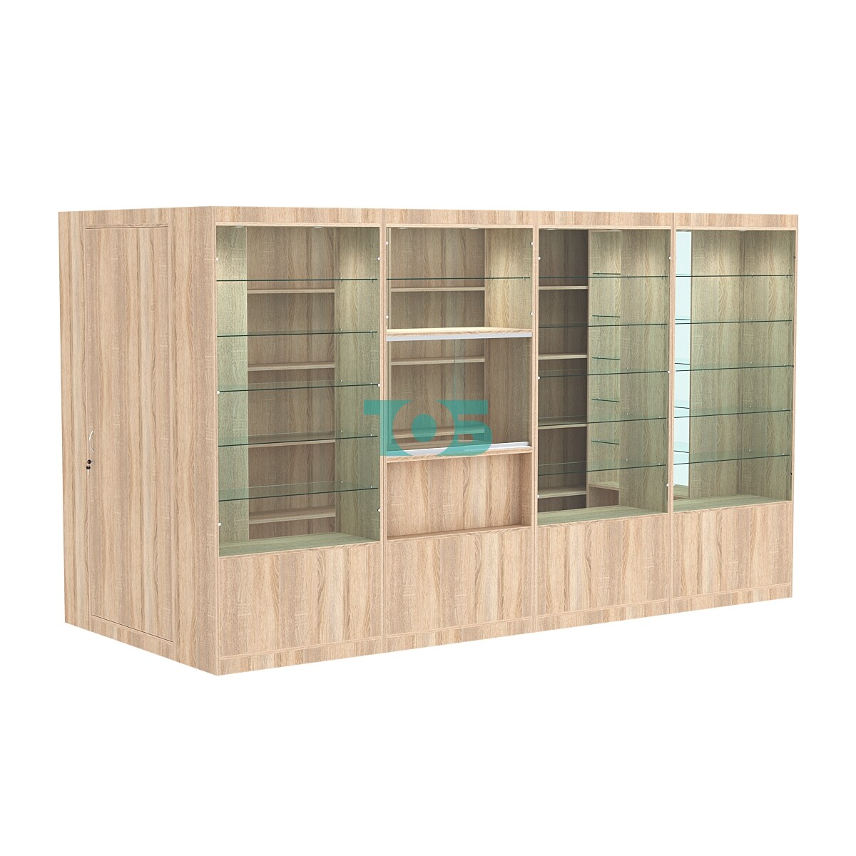 • Полки: в павильоне предусмотрено по пять стеклянных полок с каждой стороны, что обеспечивает достаточно места для размещения товаров.