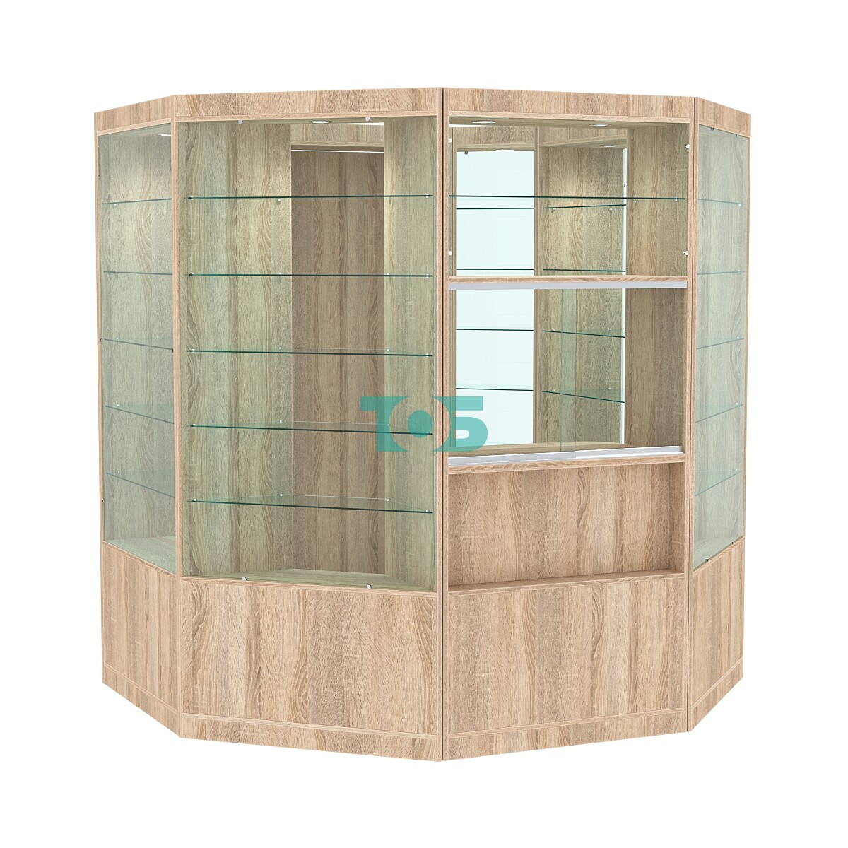 Полки: в павильоне предусмотрено по пять стеклянных полок с каждой стороны, что обеспечивает достаточно места для размещения товаров.