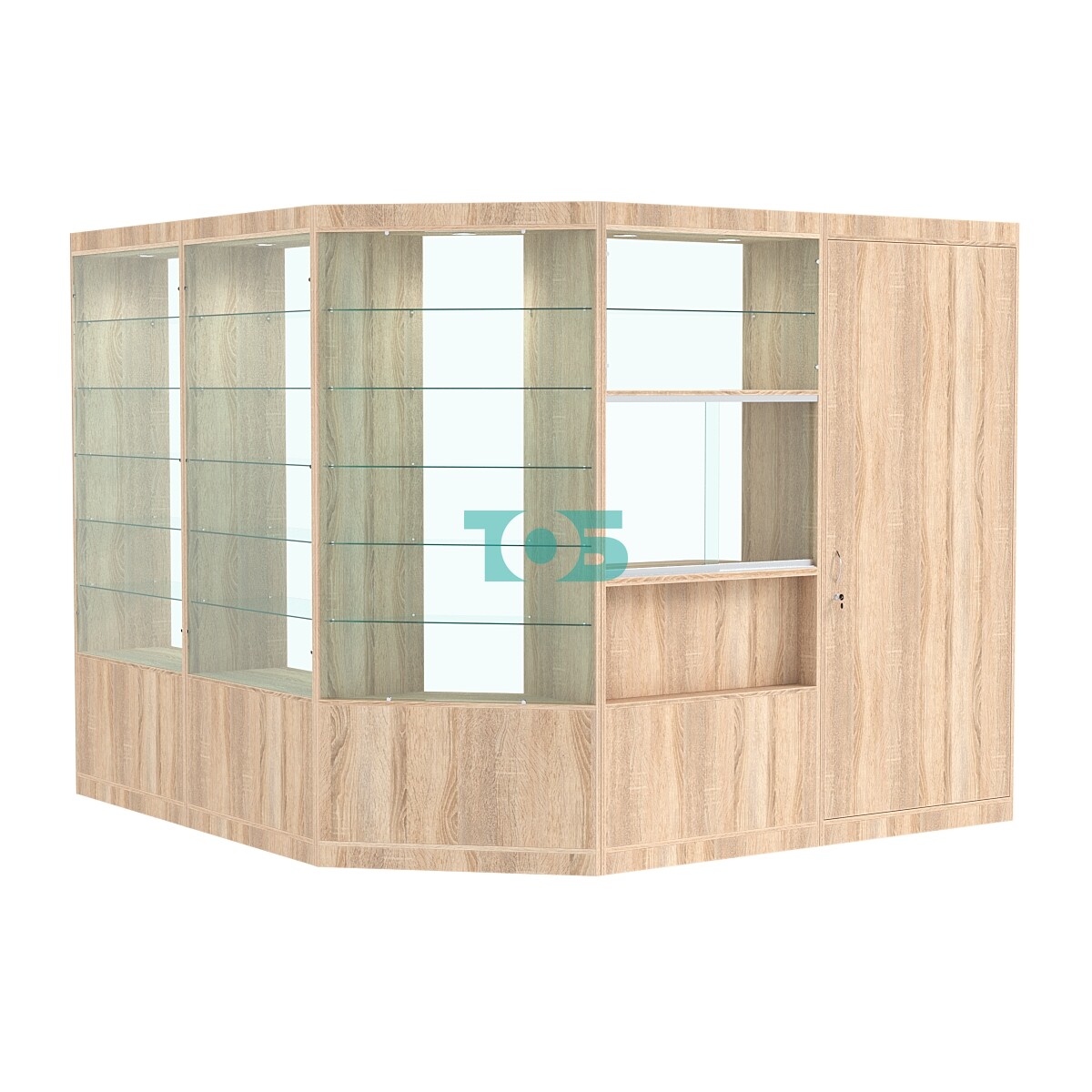 Полки: в павильоне предусмотрено по пять стеклянных полок, которые обеспечивают дополнительное пространство для размещения товаров.