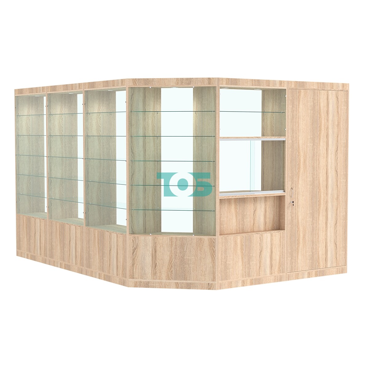 Витрина-прилавок: для общения между покупателем и продавцом предусмотрена витрина-прилавок с раздвижными стёклами, что способствует удобному взаимодействию.