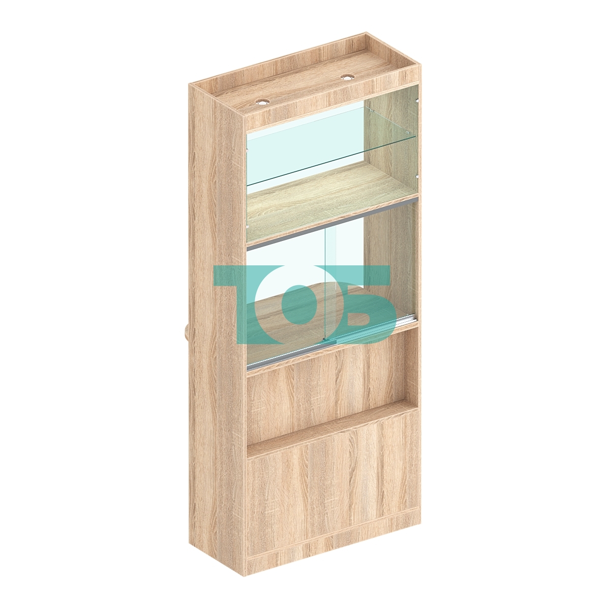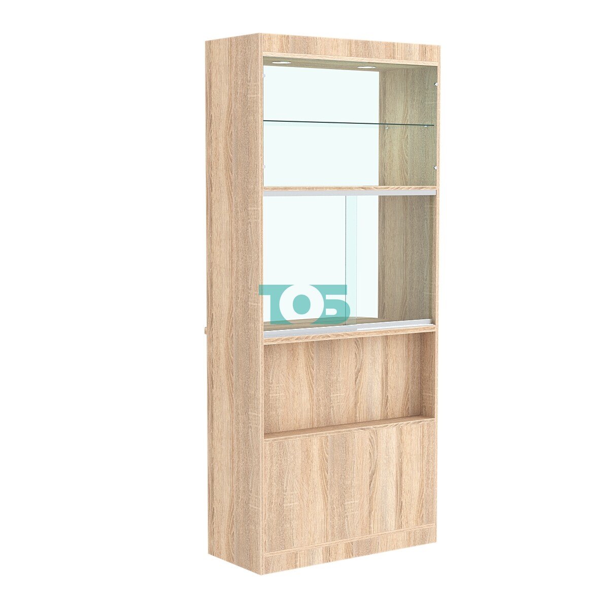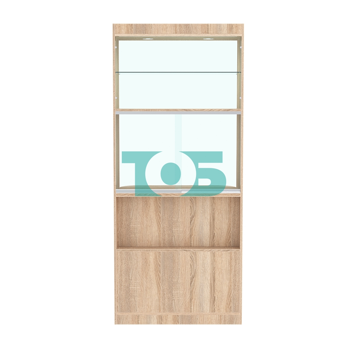 • Верхняя часть витрины: включает две полки для демонстрации товаров с верхней подсветкой, что позволяет эффективно представить продукцию и привлечь внимание покупателей.