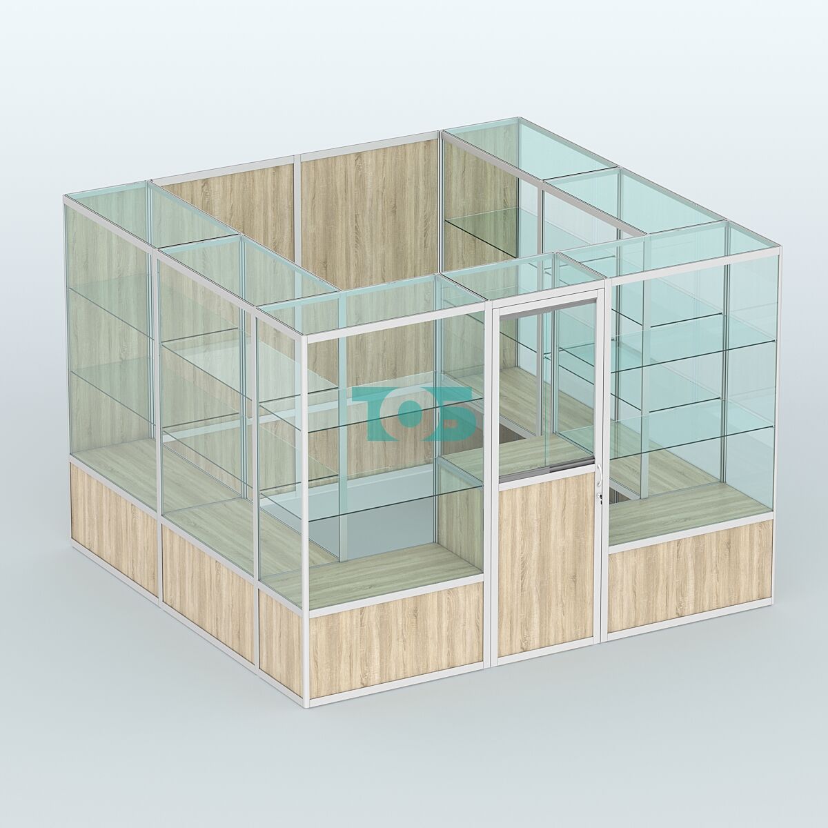 Форма: прямоугольная с глухой задней стенкой, что придаёт павильону строгий и лаконичный вид.