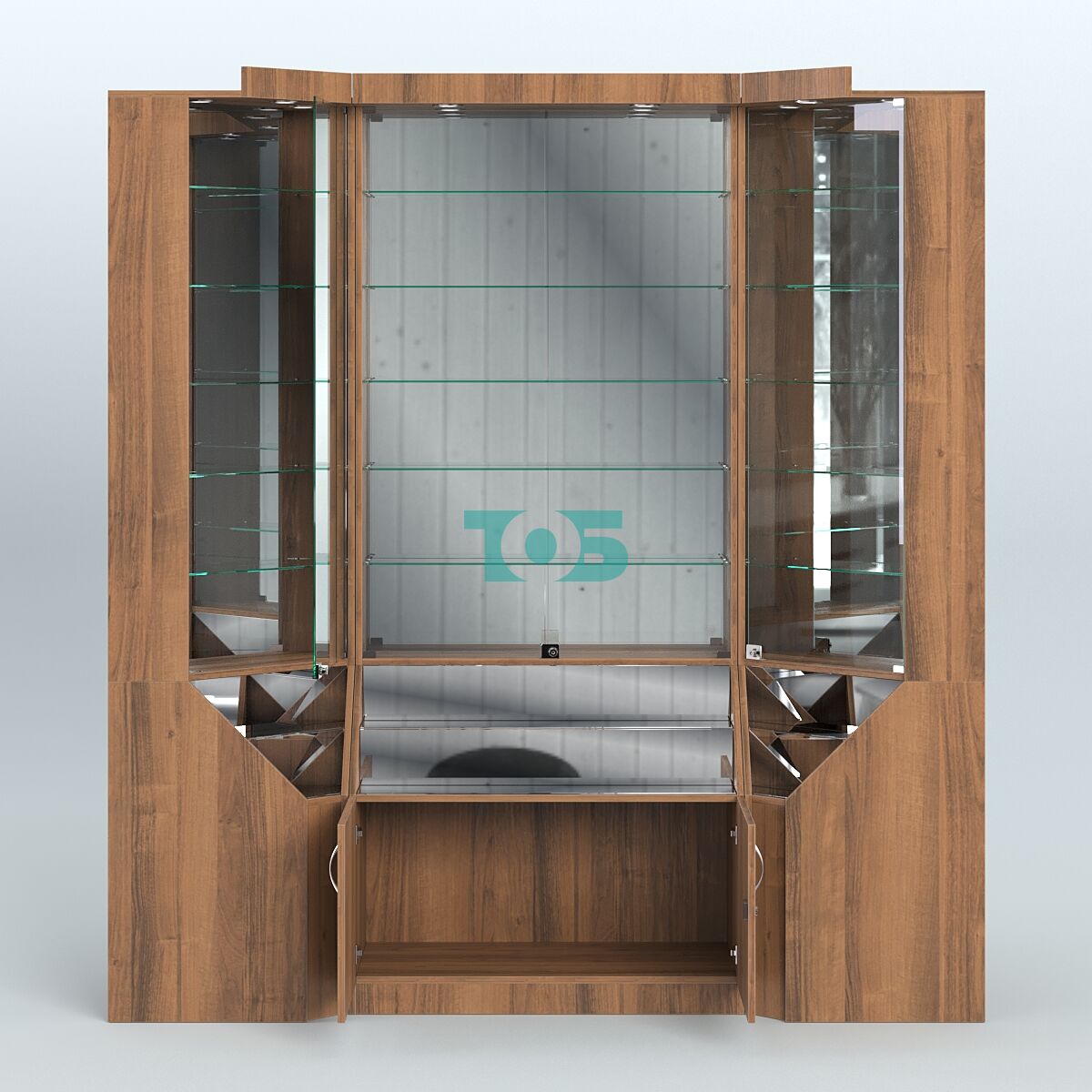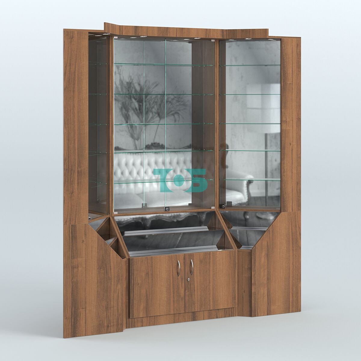 - витрины оборудованы верхним фризом с подсветкой, зеркальной задней стенкой, запирающимися на ключ дверцами.