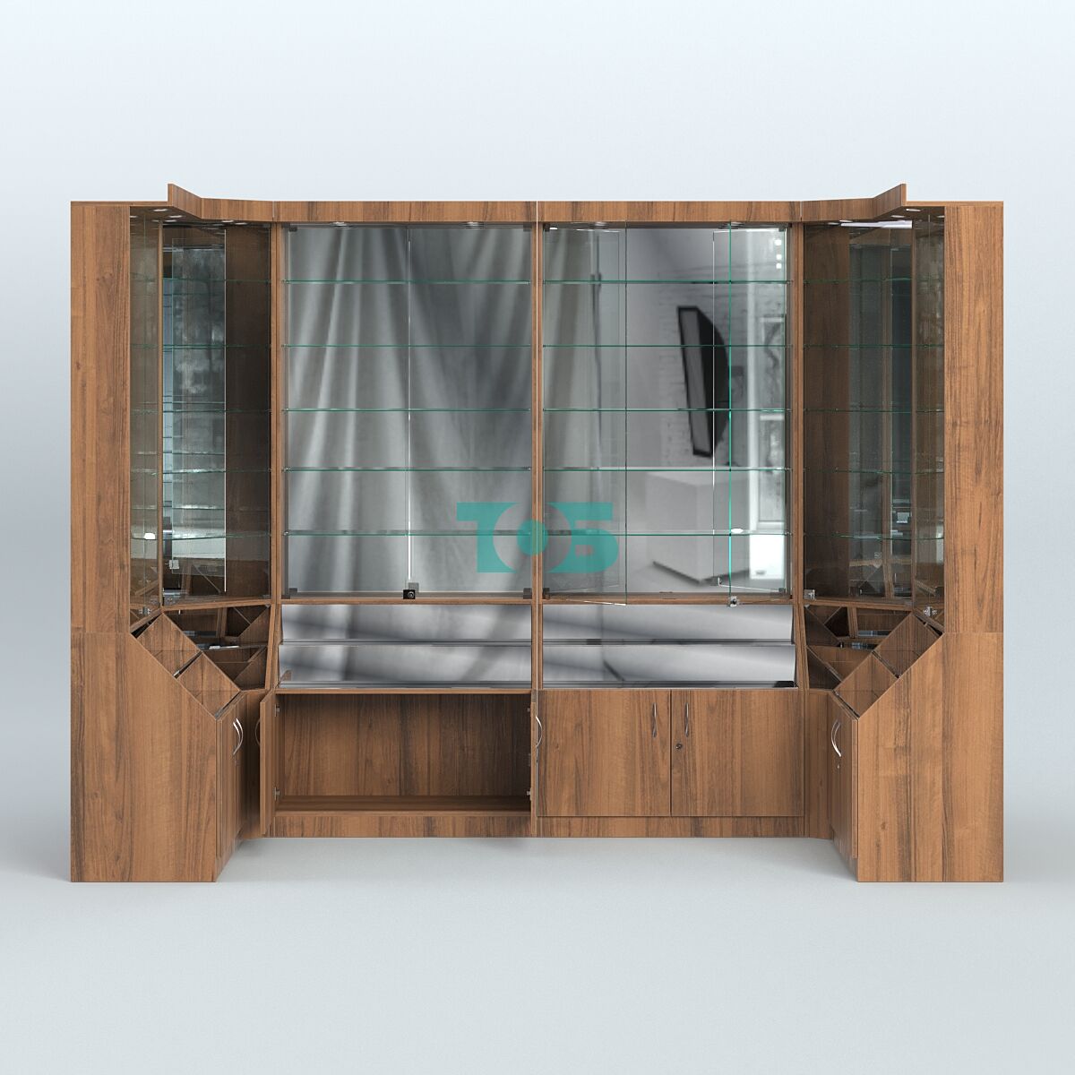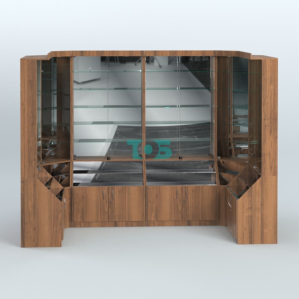 - Витрины оборудованы верхним фризом с подсветкой, зеркальной задней стенкой, запирающимися на ключ дверцами.