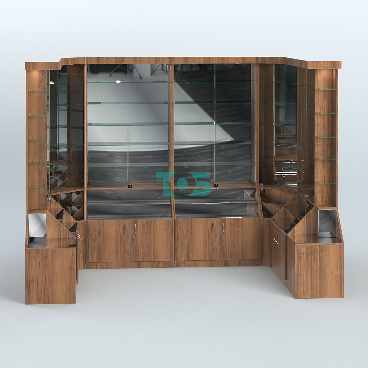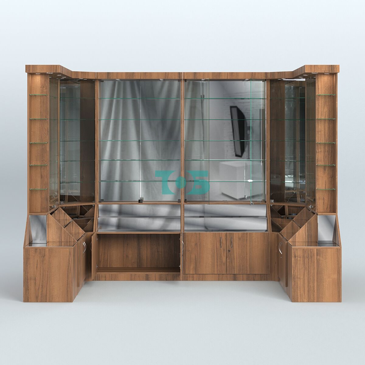 - Витрины оборудованы верхним фризом с подсветкой, зеркальной задней стенкой, запирающимися на ключ дверцами.