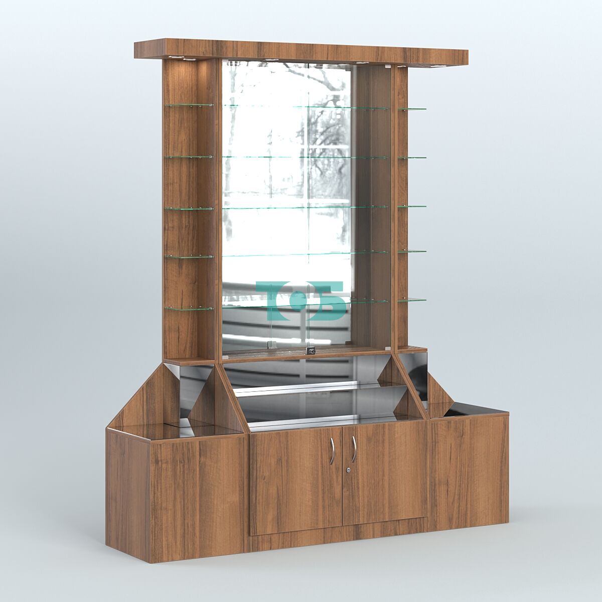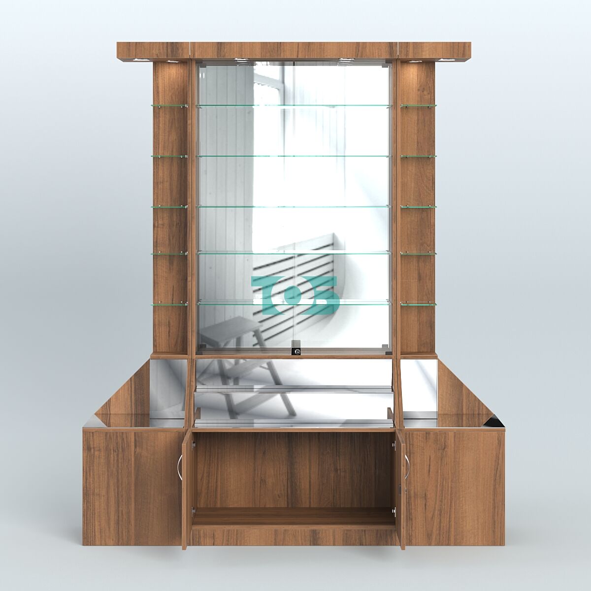 - Витрины оборудованы верхним фризом с подсветкой, зеркальной задней стенкой, запирающимися на ключ дверцами.