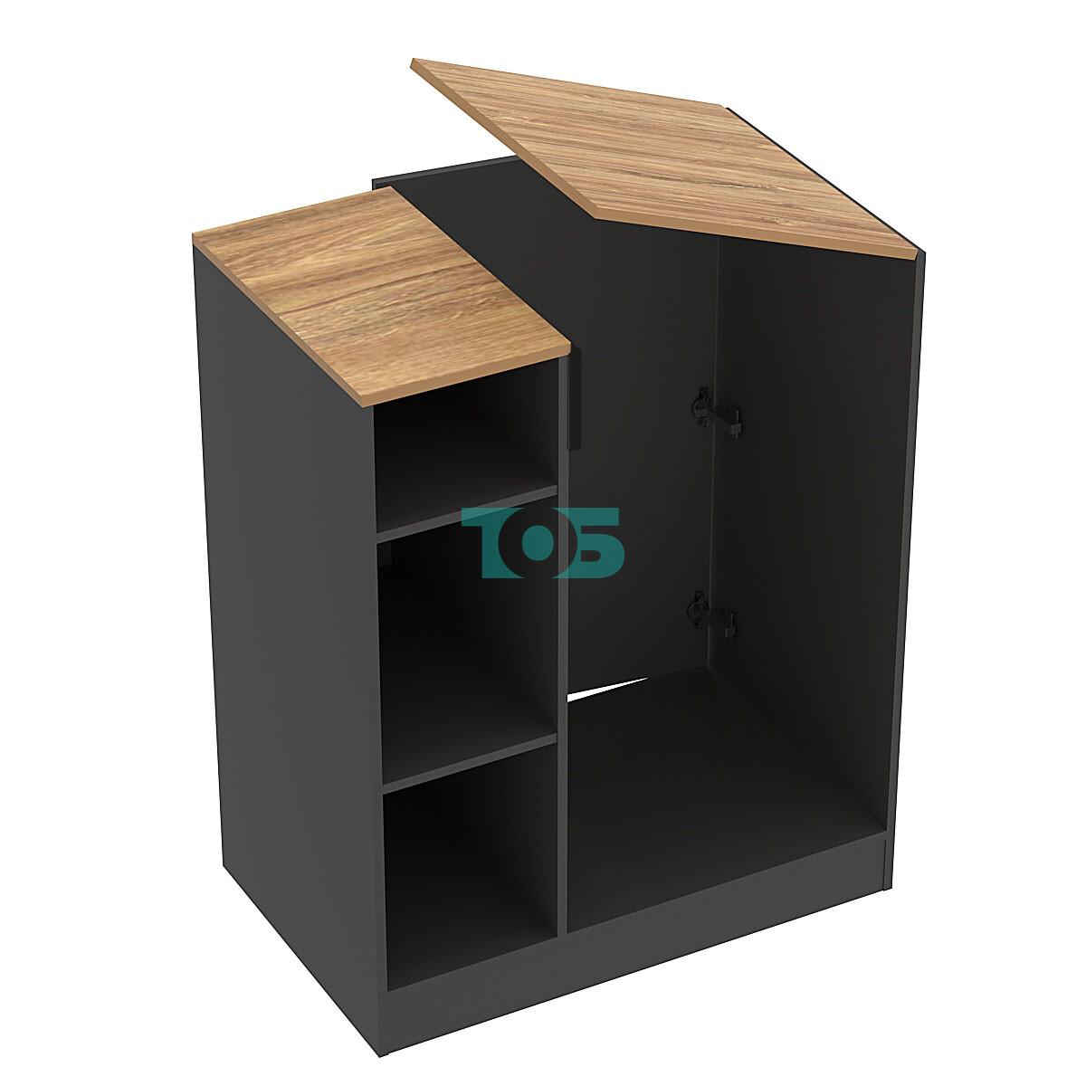 Функциональность правой части: правая часть прилавка укомплектована откидной крышкой и распашной дверкой с шпингалетом, что обеспечивает удобство доступа к хранимым товарам и их защиту.