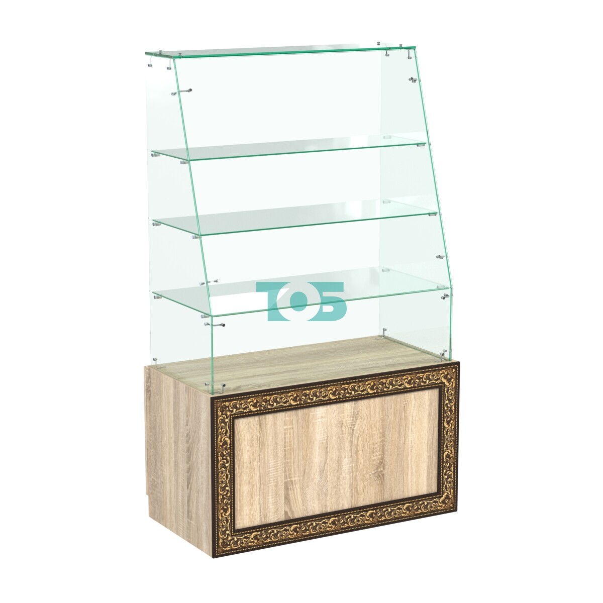 Отличия модели стеклянного прилавка с декором и наклонным фасадным стеклом №СПБА-15: