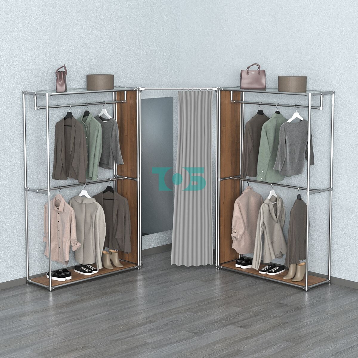 - правый и левый блок с продольными поручнями для одежды образуют угловое пространство для примерочной;