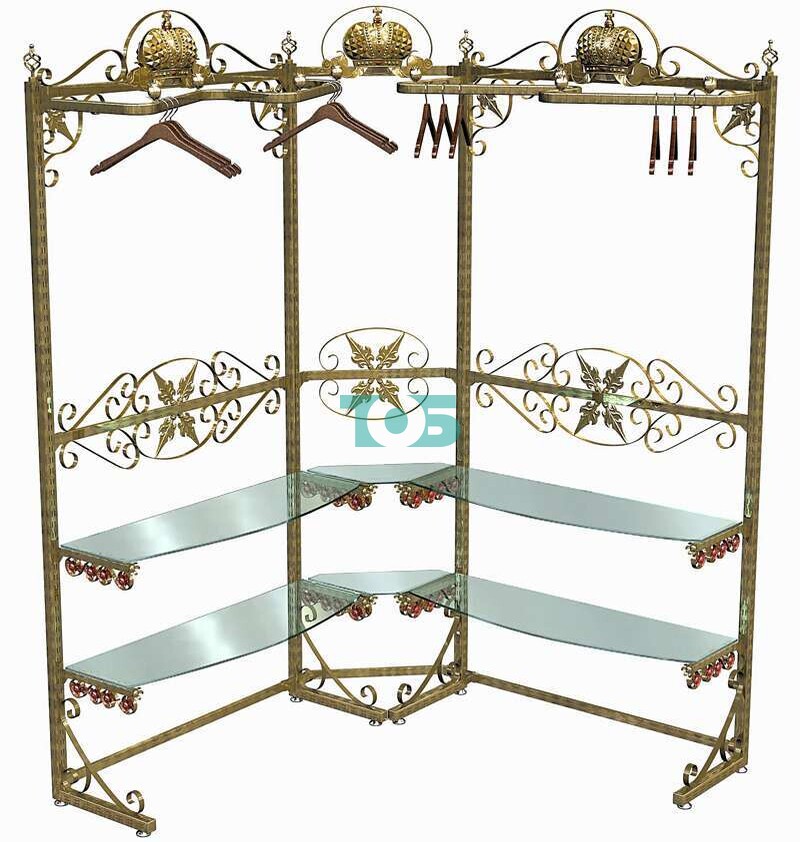 Главная Каталог Торговое оборудование с ковкой и декорами серии БАРОККО Торговая система для продажи одежды КОРОНА Пристенные системы угловые КОРОНА H2600 мм