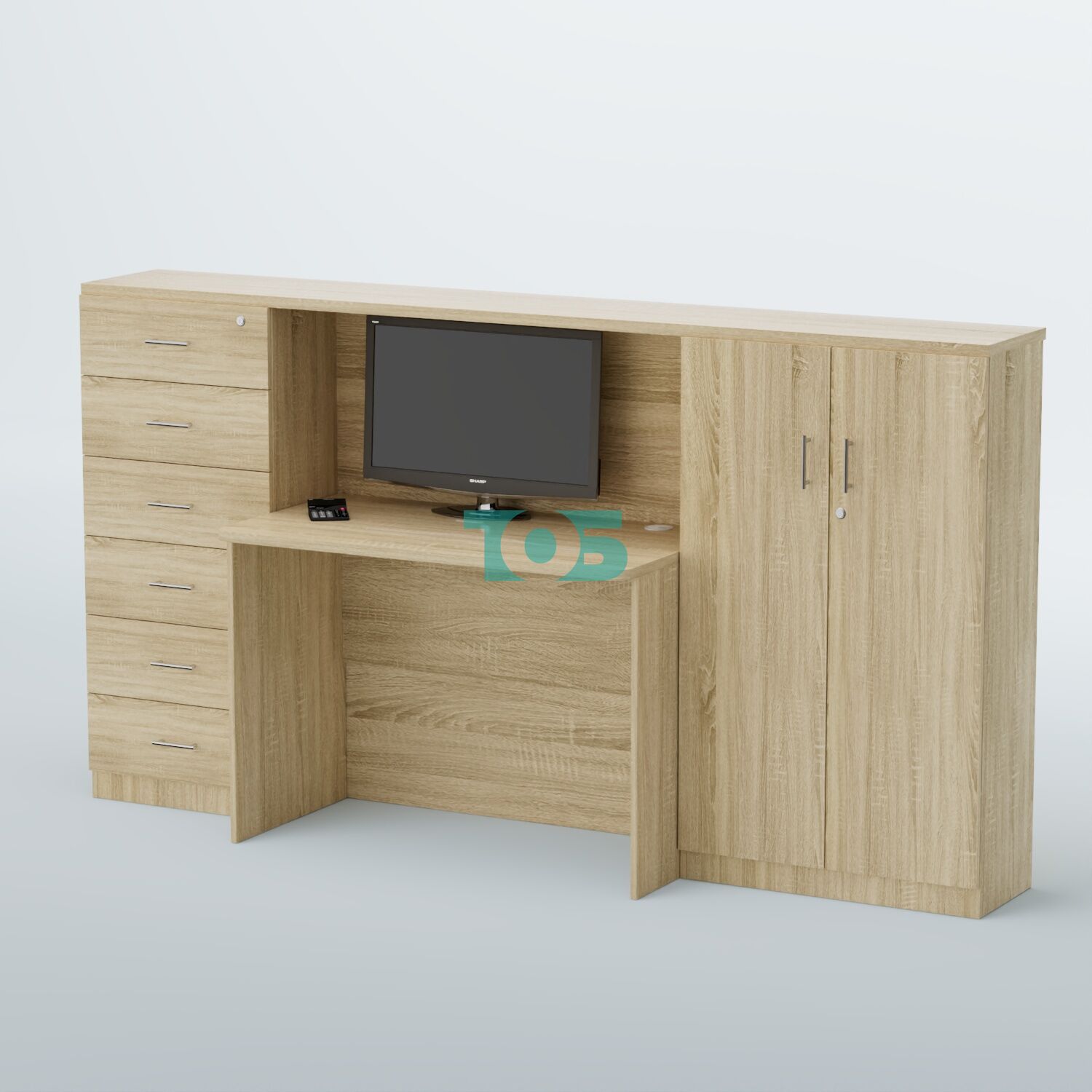 • Левая часть: шкаф шириной 550 мм с 6-ю выдвижными ящиками, верхний ящик закрывается на замок, что обеспечивает дополнительную безопасность для хранения ценных вещей и документов.