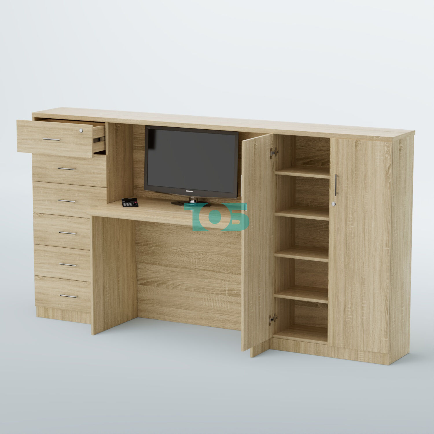 Левая часть: шкаф шириной 550 мм с 6-ю выдвижными ящиками, верхний ящик закрывается на замок, обеспечивая дополнительную безопасность для хранения ценных вещей и документов.