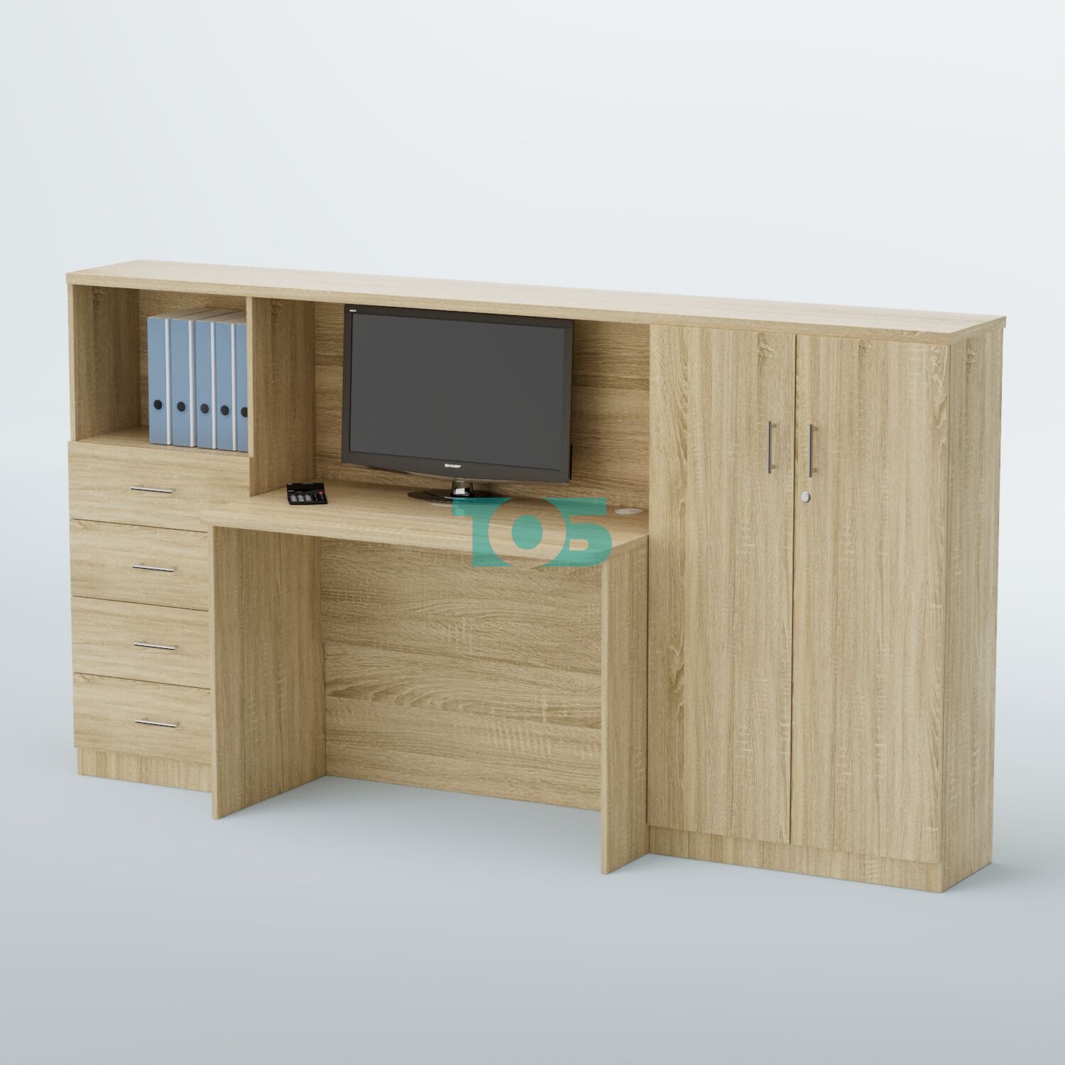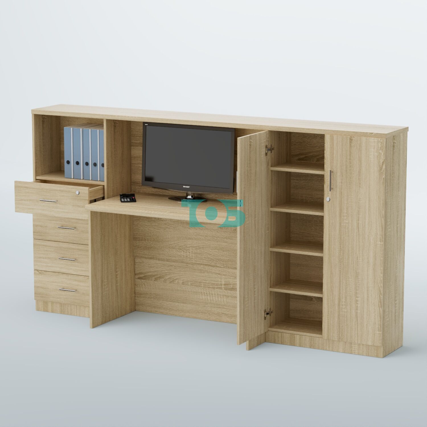 Левая часть ресепшена — это шкаф шириной 550 мм с четырьмя ящиками (верхний ящик закрывается на замок) и открытой полкой для размещения документов или оргтехники. Размеры открытой полки составляют 400 x 516 x 300 мм, что позволяет удобно разместить необходимые предметы.