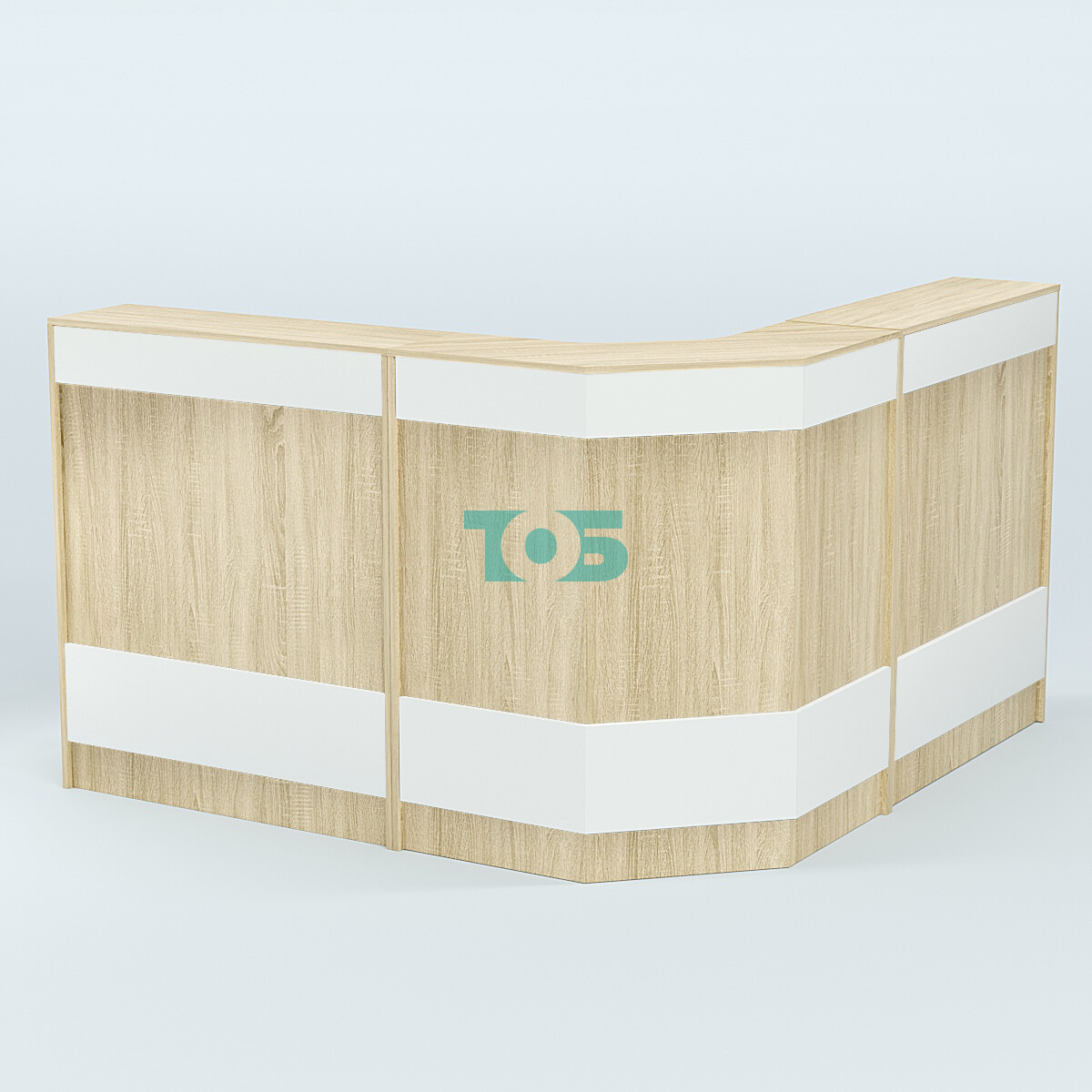 Ресепшен серии ПРАЙМ №5Б угловой — это стильное и функциональное решение для создания впечатляющей зоны ресепшена в вашем офисе или торговом пространстве. Его угловая большая форма и возможность индивидуальной настройки цветовой гаммы фасадных панелей делают его идеальным выбором для современных и просторных интерьеров.