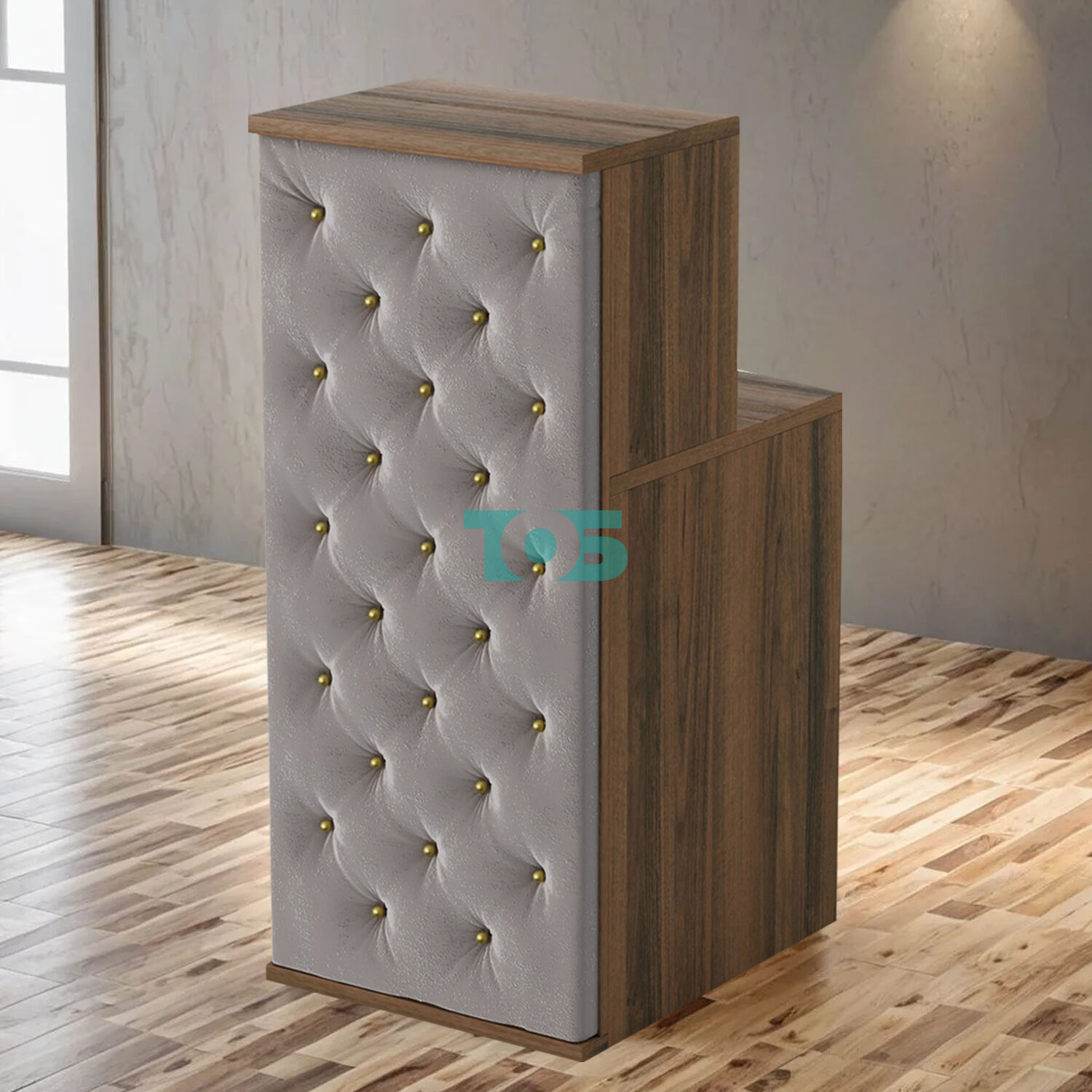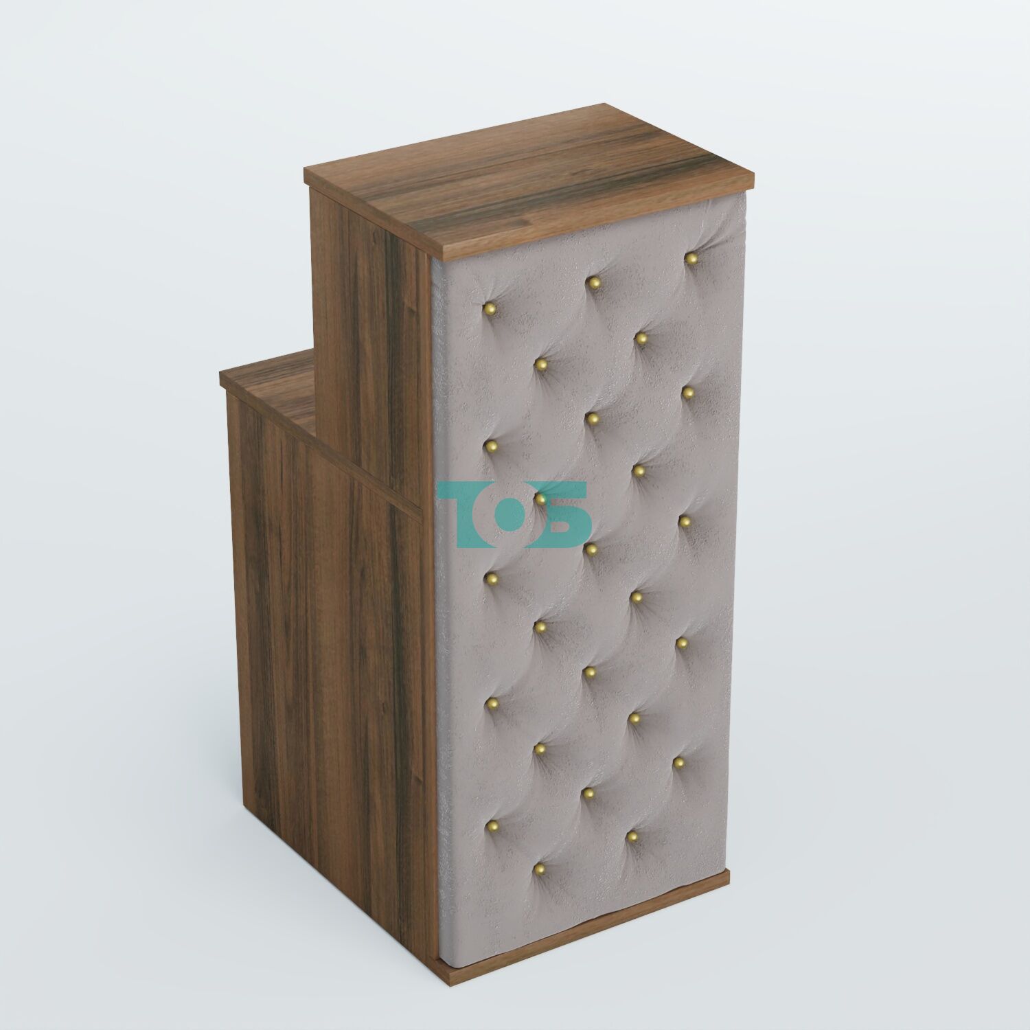 Фронтальная часть ресепшена декорирована обивкой из серого велюра под бархат, что придает изделию роскошный и изысканный вид.