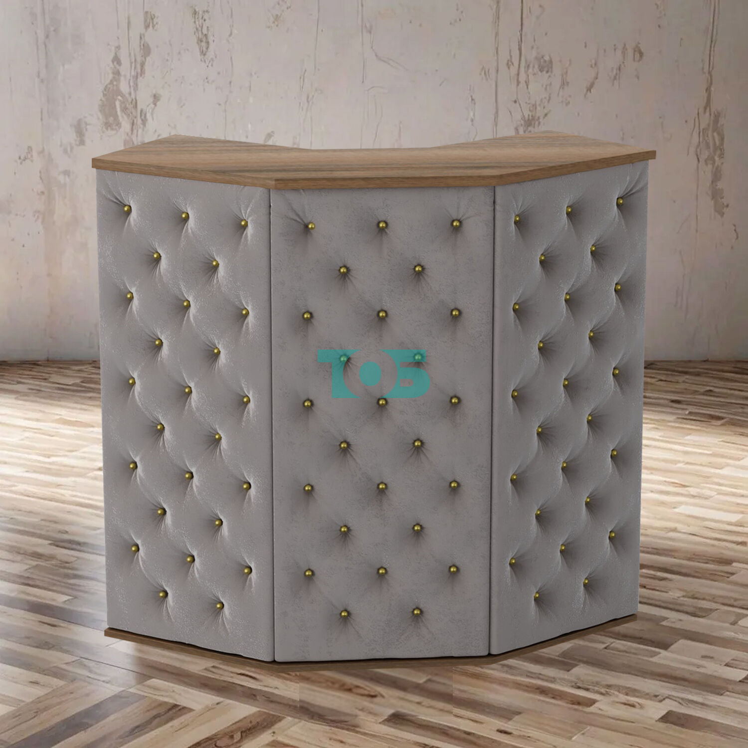 Фронтальная часть ресепшена декорирована обивкой из серого велюра, имитирующего бархат, с каретной стяжкой и золотыми втулками. Этот элемент добавляет ресепшену роскошный и изысканный вид, подчеркивая его уникальность и привлекательность.