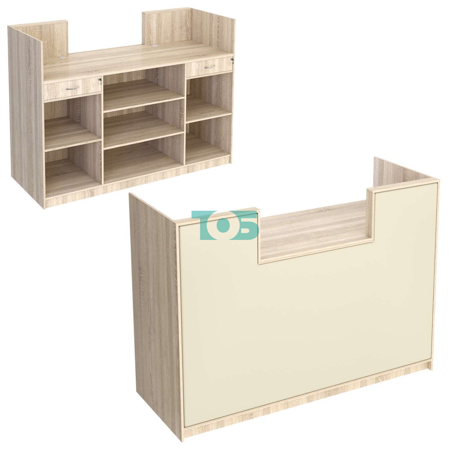 • Правая и левая стороны ресепшена со стороны продавцов укомплектованы выдвижными ящиками с врезными замками и секциями с полками, что обеспечивает удобное хранение документов и других предметов.